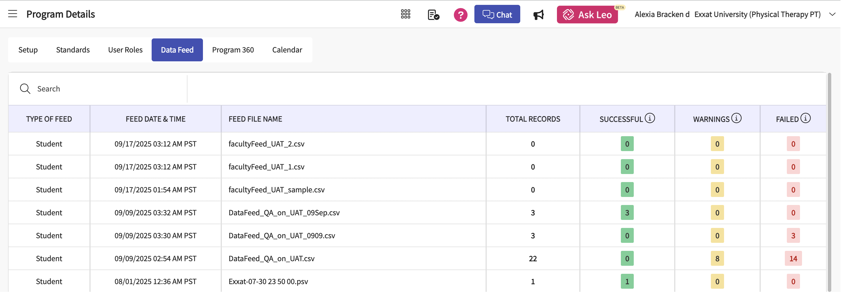 Data feed interface in Exxat Prism provides details of the Student Feed instances and its results.