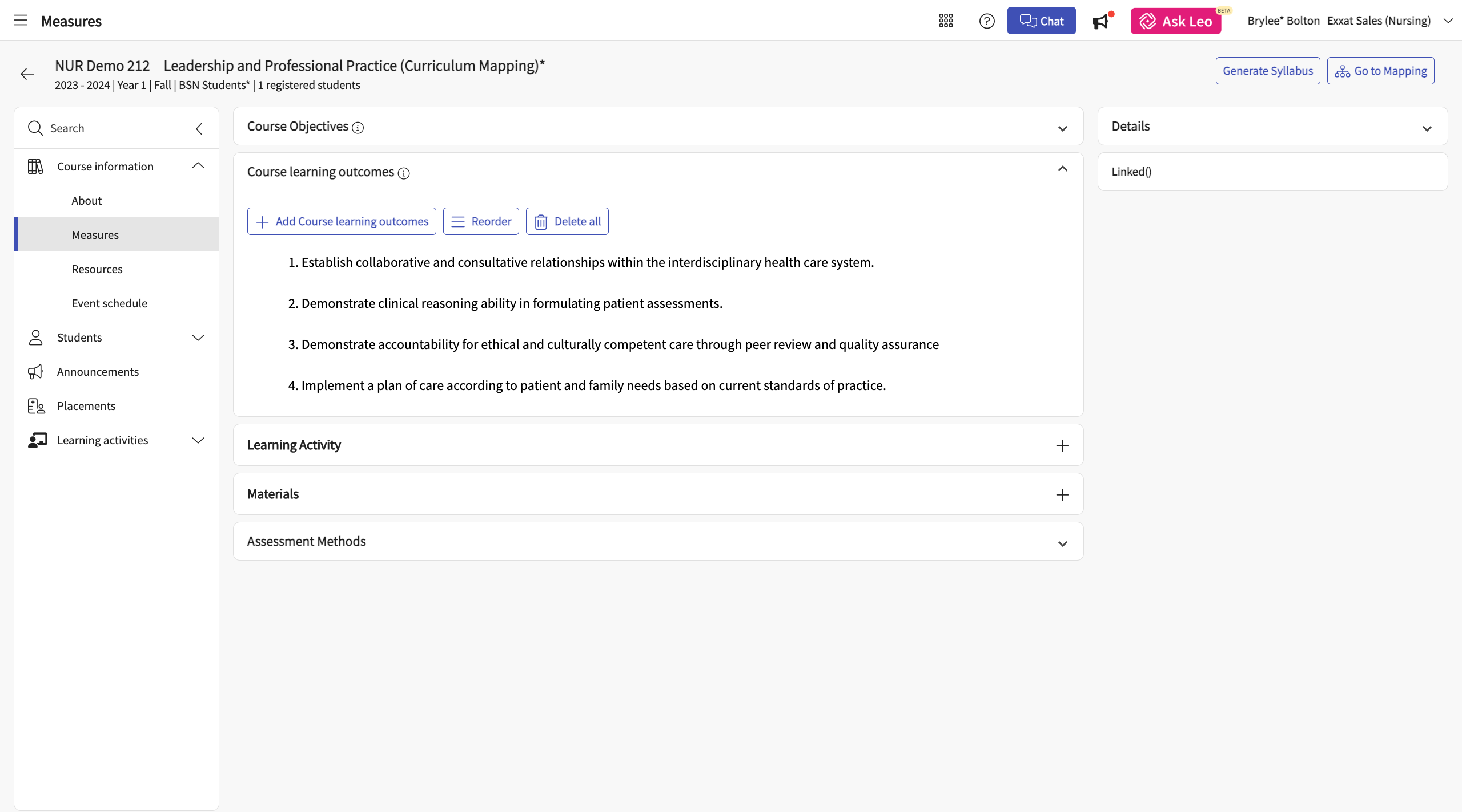 Measures are the components that build your courses I.e course objectives, instructional objectives, course learning outcomes, course goals etc. You can add, edit, and delete them directly in the system.
