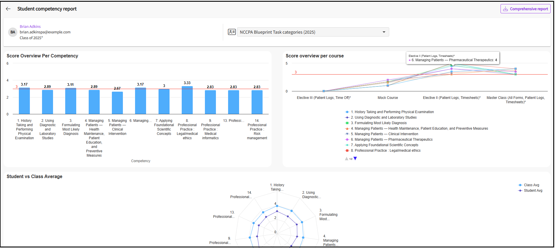 Exxat Prism's Competency Management module allows users to track student's achievement of competencies across curriculum by aggregating data from multiple evaluations.