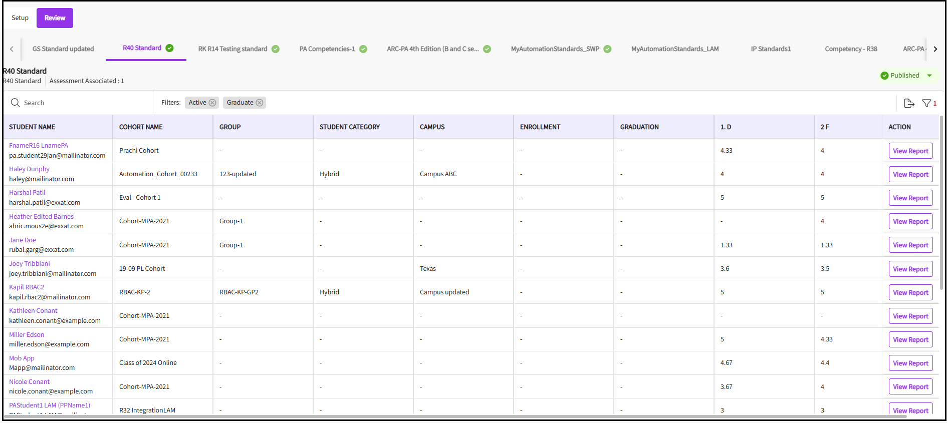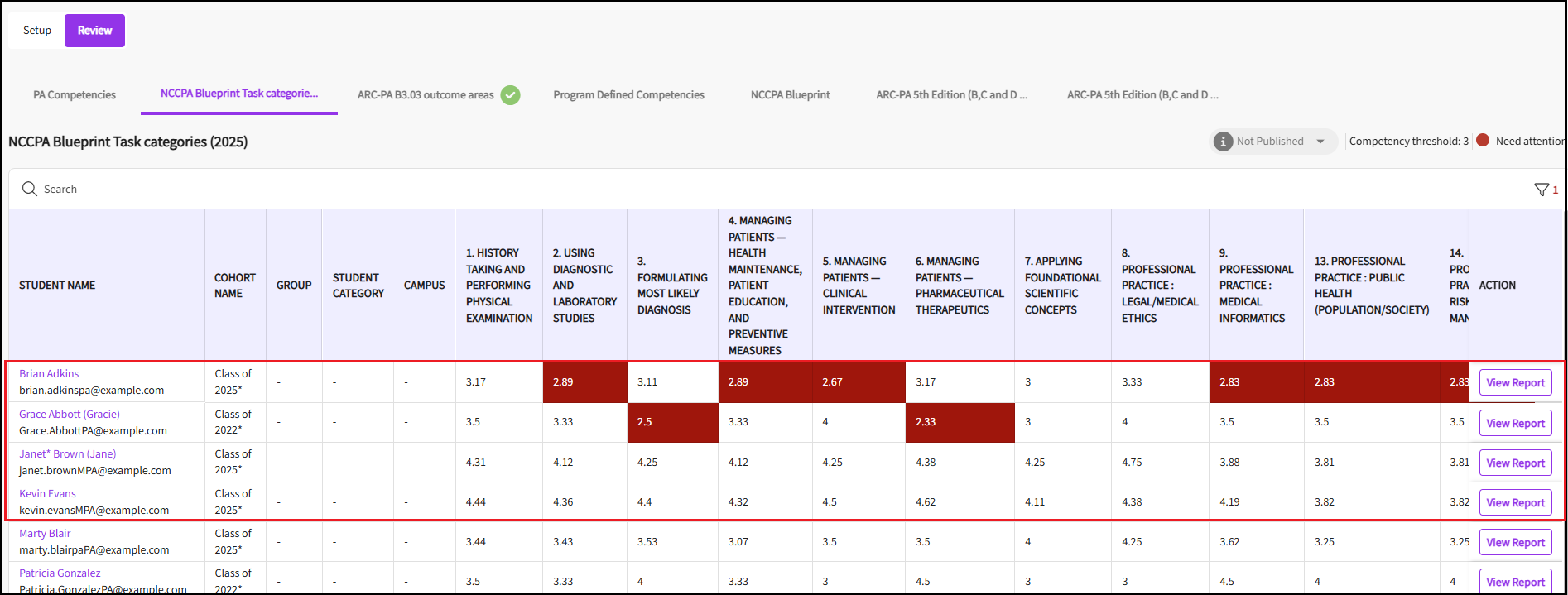 Once the Competency framework is setup, assessments are mapped to competencies, and assessments are scored, you can review the scores for each competency and its various levels for each student in the Review tab.
