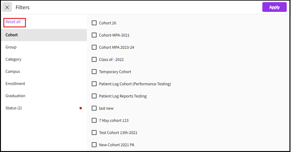 Click Reset all in the Filters drawer to clear the filters quickly. - Click the Export icon