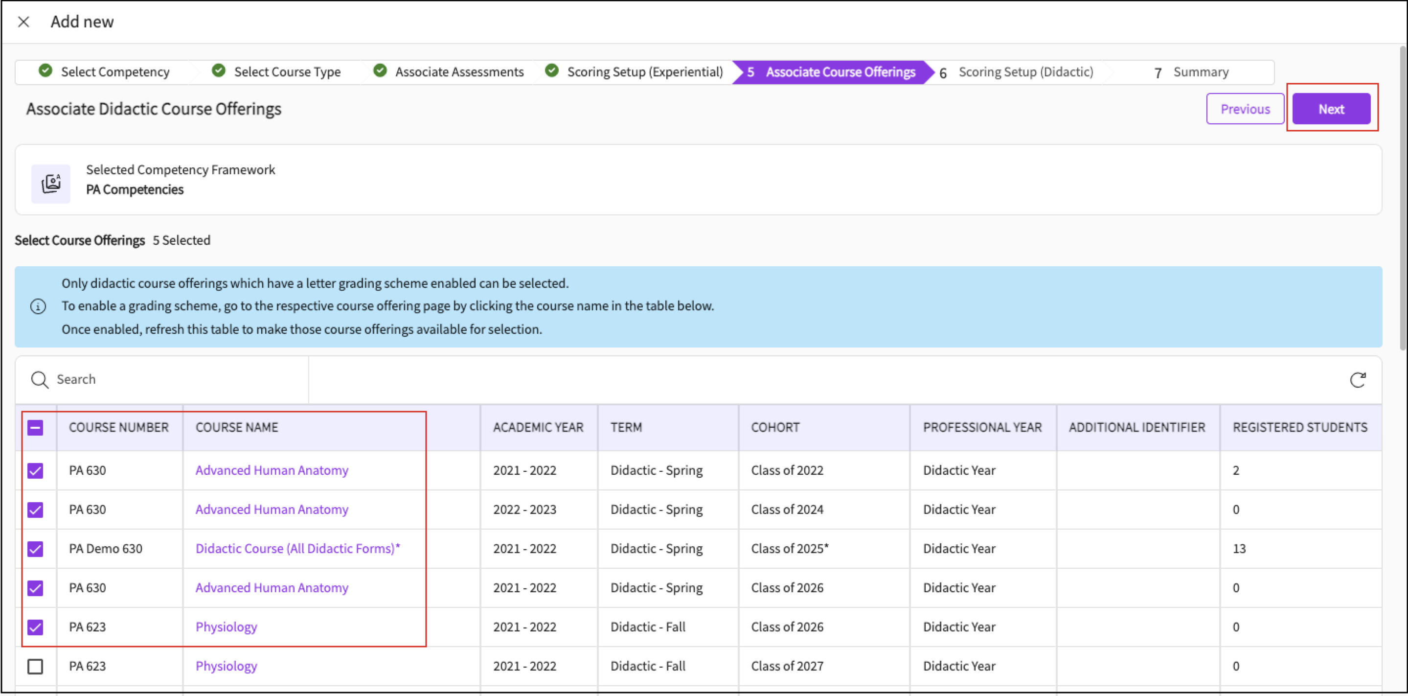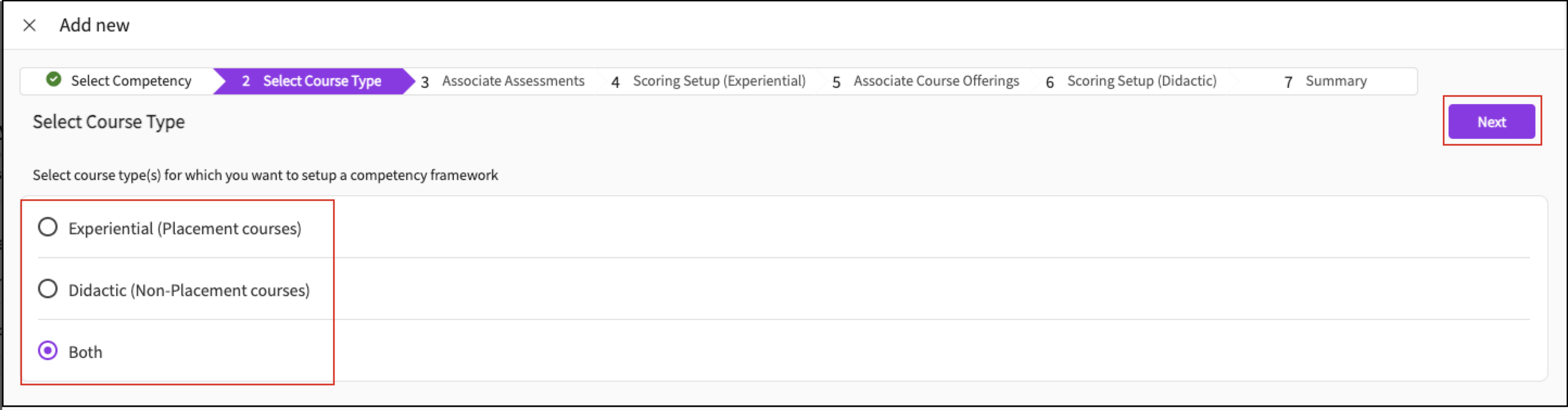 Select the Course Type - Experiential (Placement-course),Didactic (Non-placement course) or both to setup the competency framework and click Next.