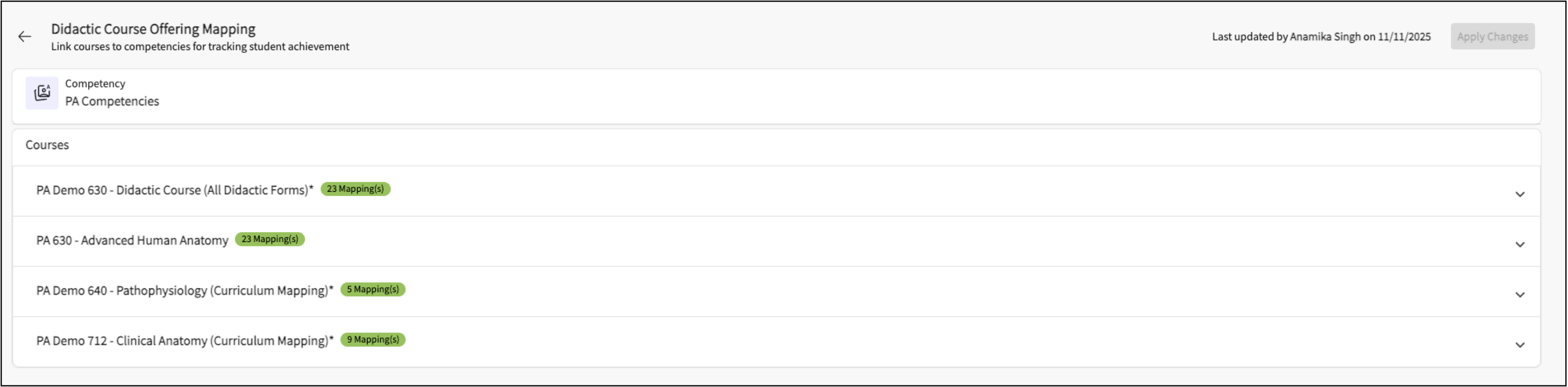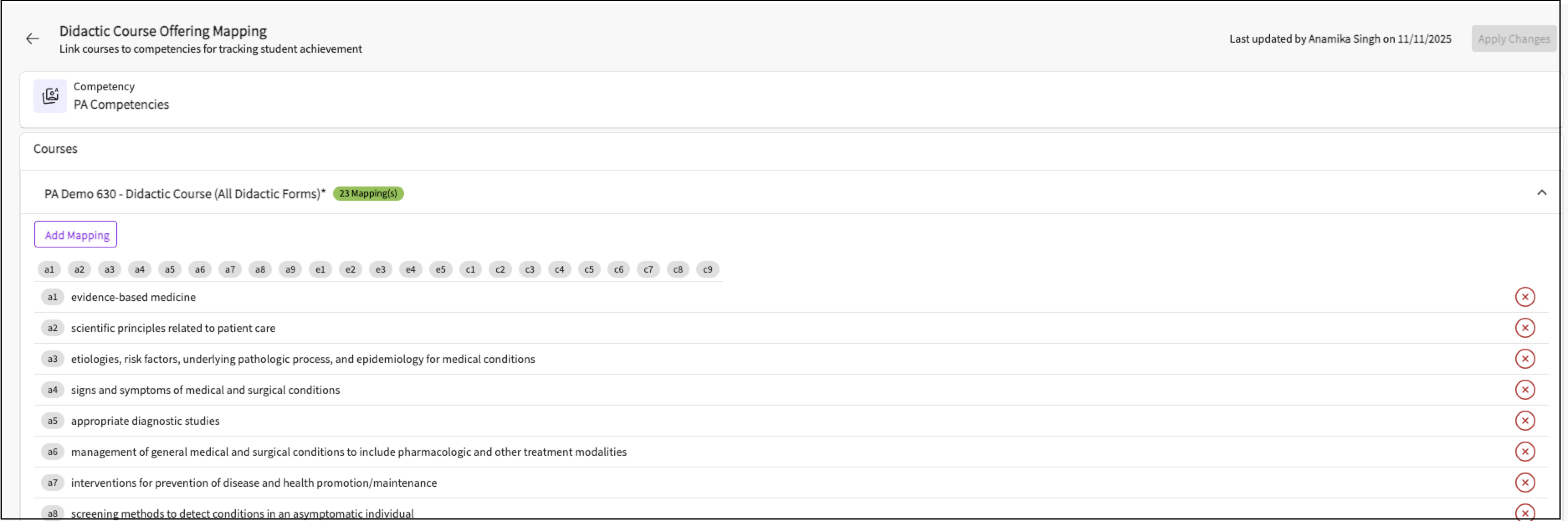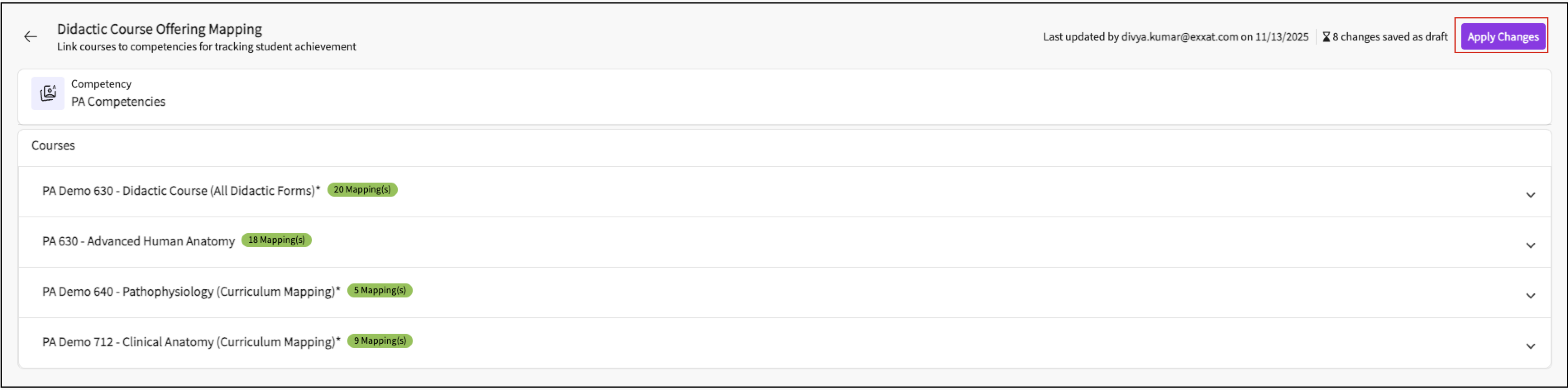The hourglass icon also includes a text displaying the number of changes saved as draft. - Click Apply Changes to publish the competency mapping.