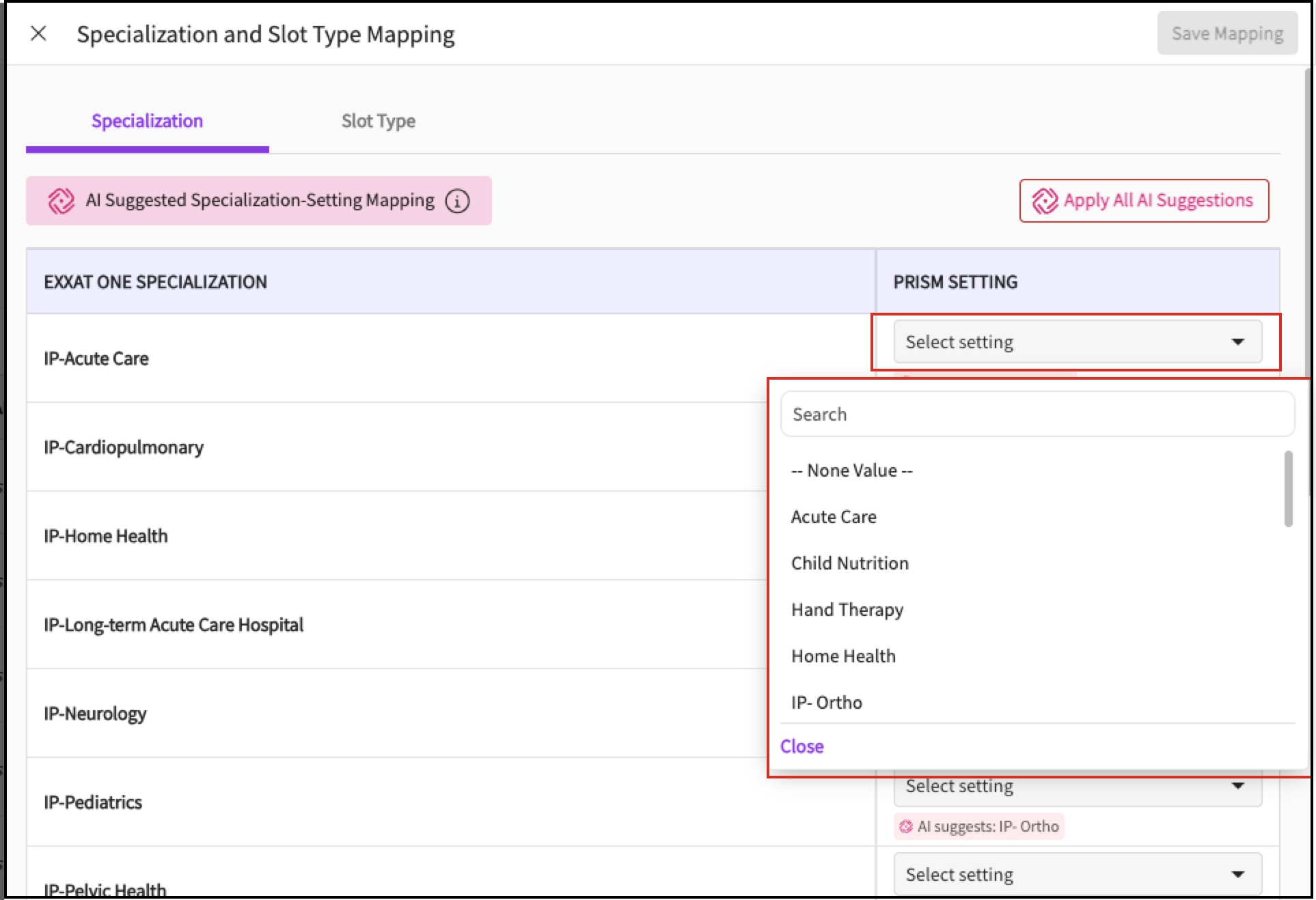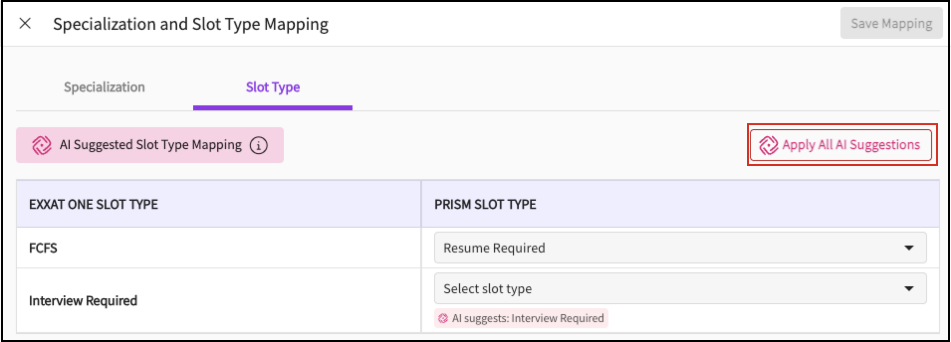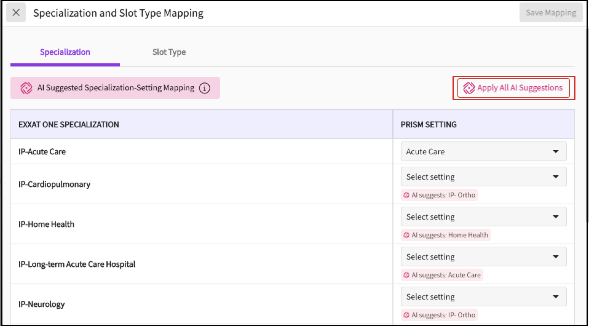 in the top-right corner of the Specialization or Slot Type Mapping drawer , click Apply All AI Suggestions.