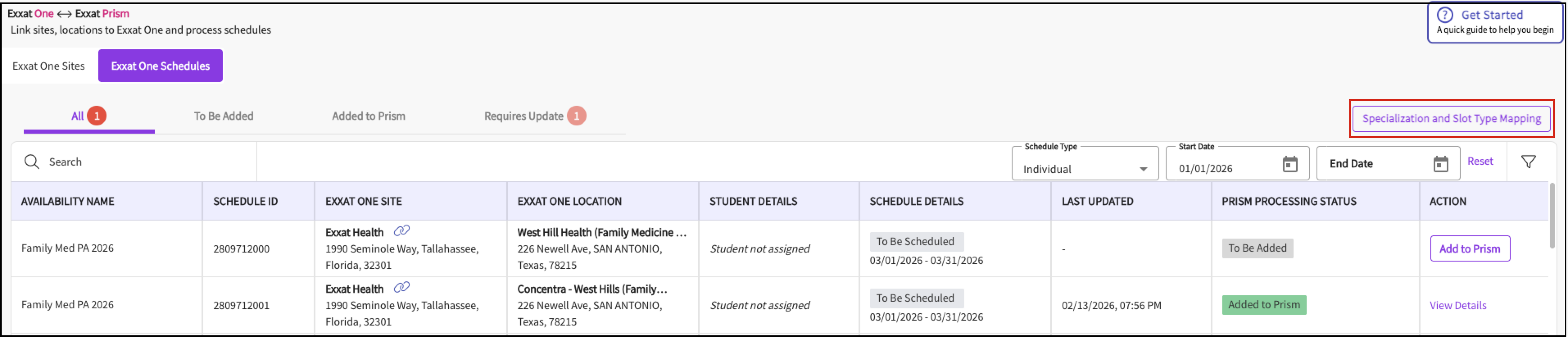To Be Added: Schedules from Exxat One that have not yet been added to Exxat Prism yet.