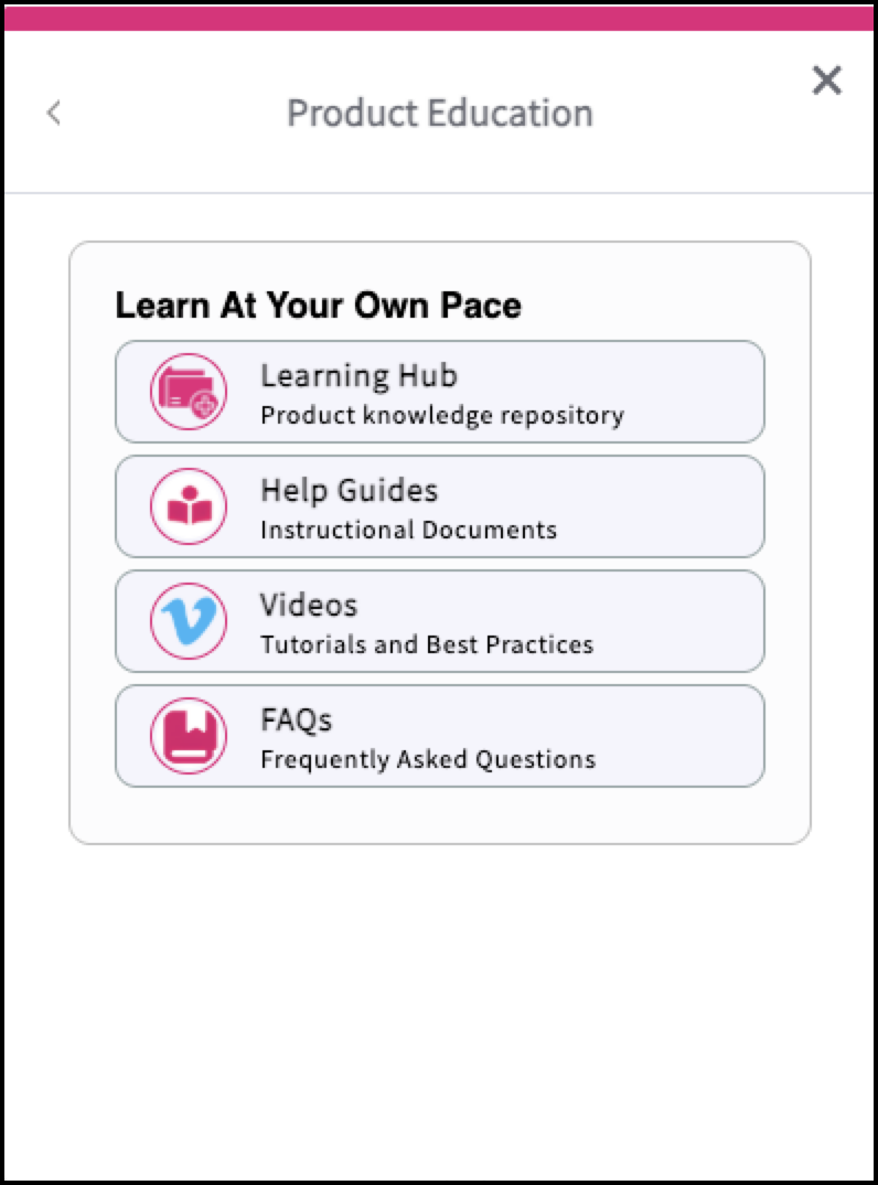 Product Education section contains information about product in various forms such as help articles, videos, case studies, planned communications, and more.