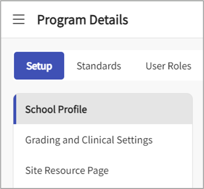 You’ll navigate to the Setup page. In the setup page you can view and manage the school profile, grading and clinical settings, and setup the site resource page.