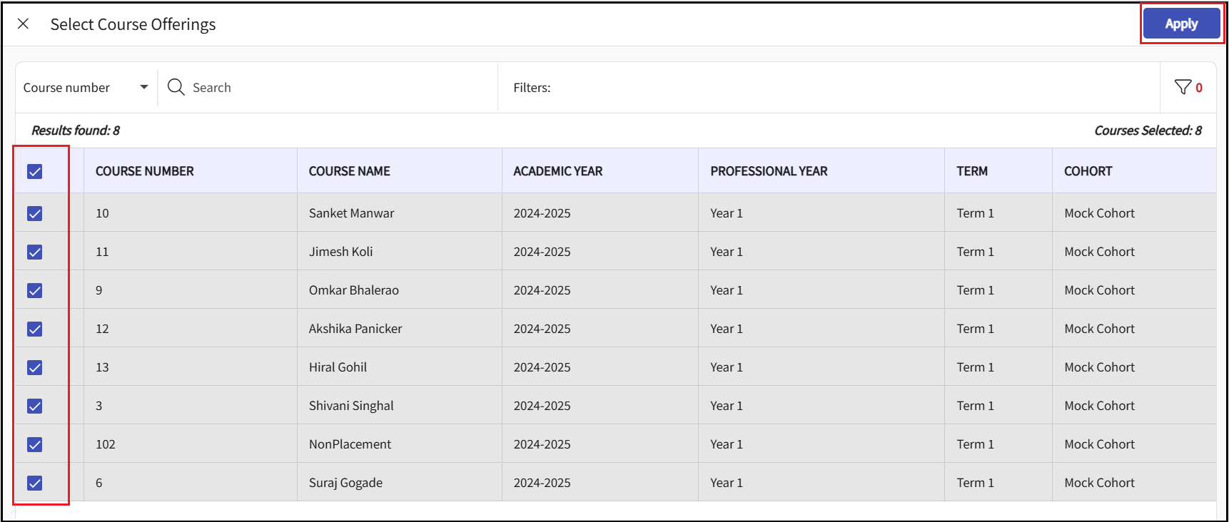 - Select the course to generate the report. You can select all the courses at once or choose individual courses as required and click Apply.