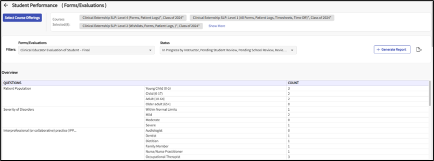 For example: If you need to see final performance evaluation data across all courses, you can select that form under “Form/Evaluation" filter. - Click Generate Report.