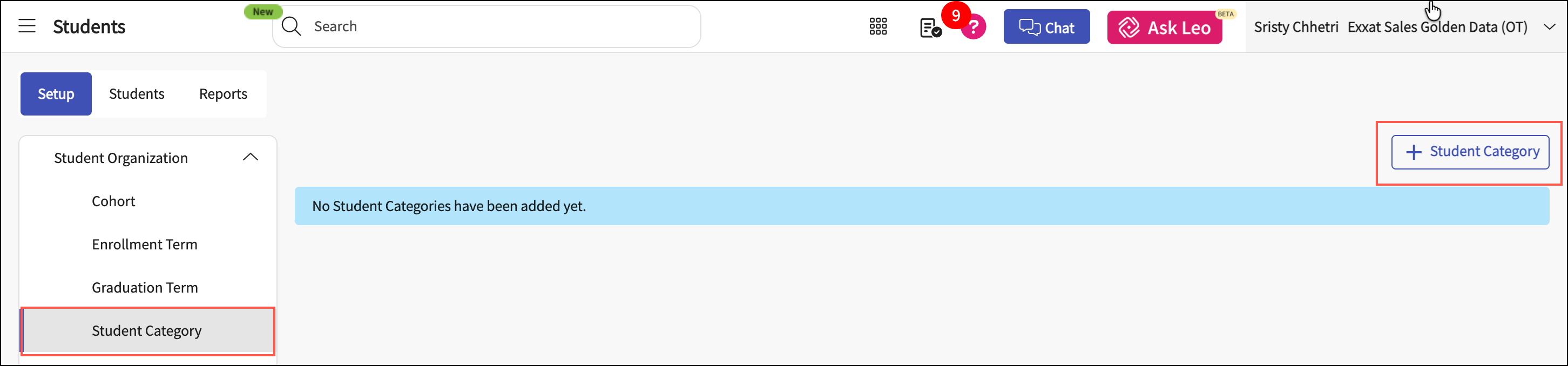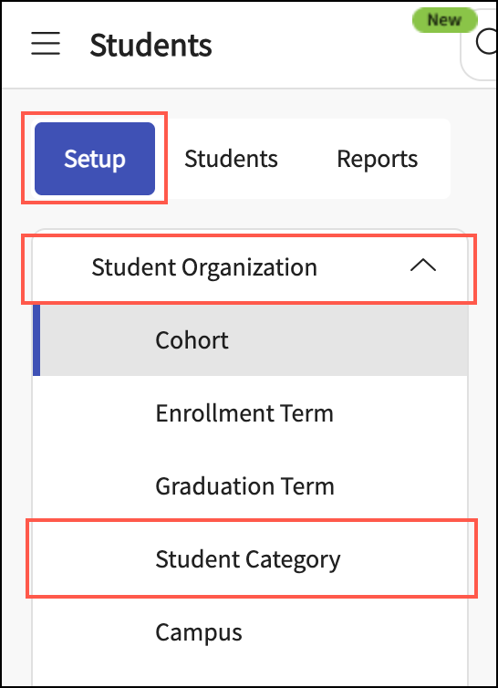 Go to the Setup tab > Student Organization section, and select Student Category.