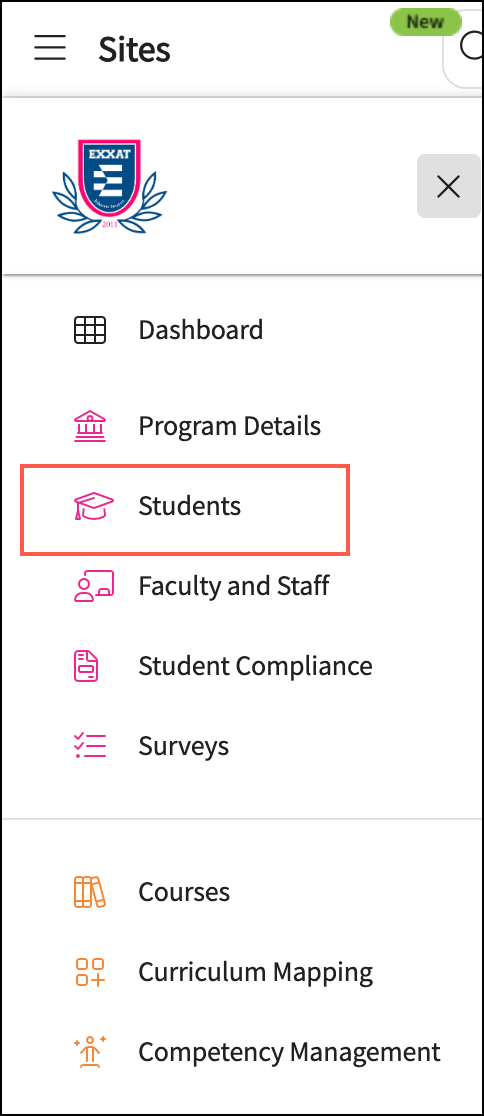 From the Exxat Prism dashboard, go to Sites, or use the hamburger menu to navigate there.