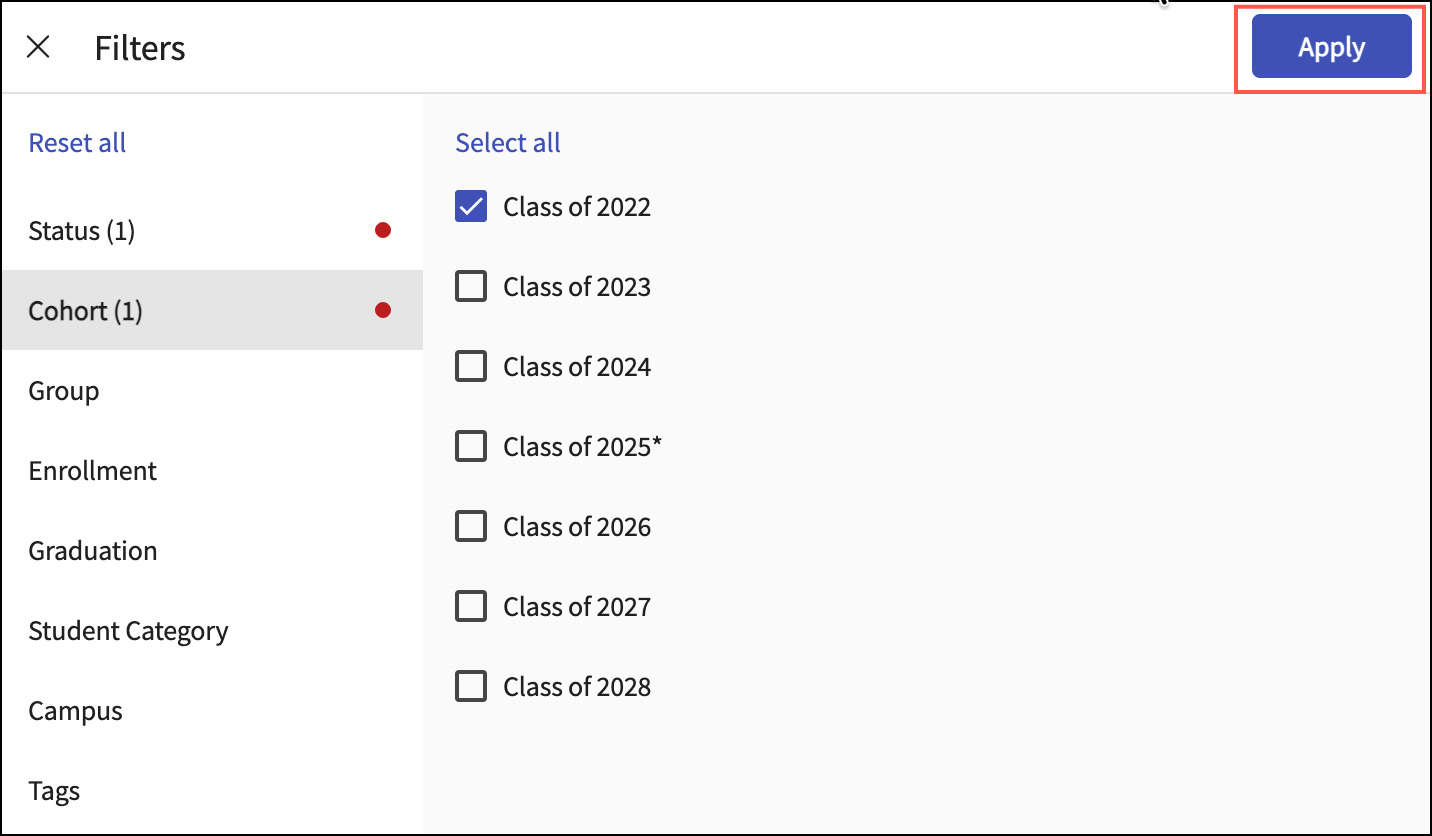 Click Apply. The filtered students appear in the Student list.