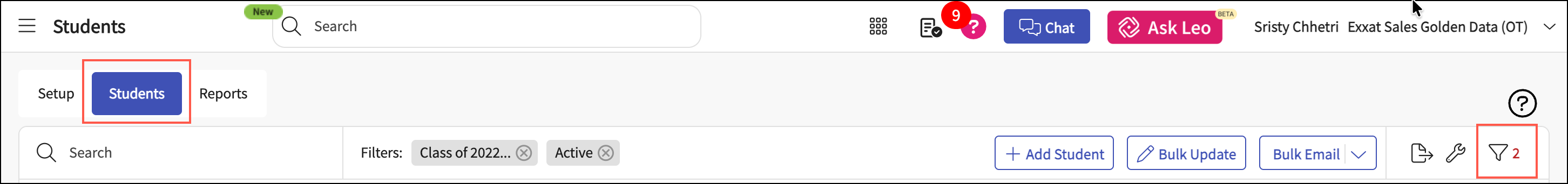 Go to the Students tab, and click the Filter icon.