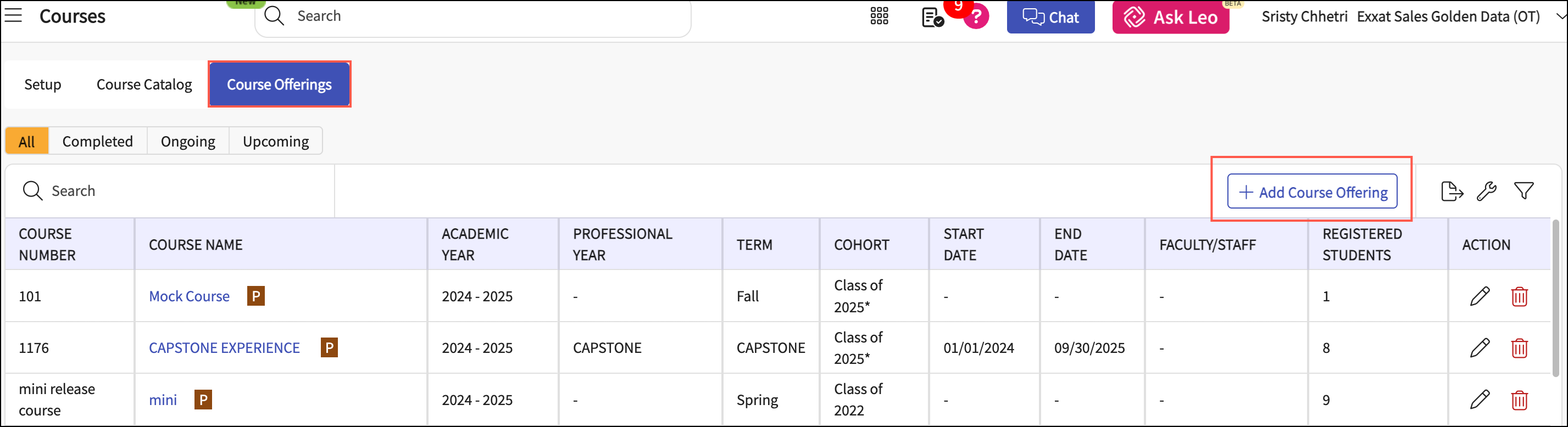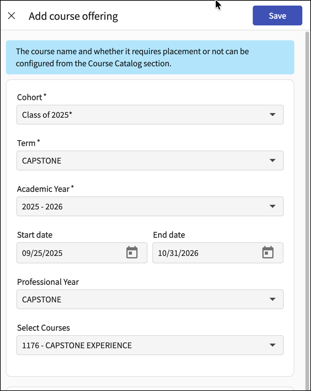 Go to the Course Offering tab and click +Add Course Offering.