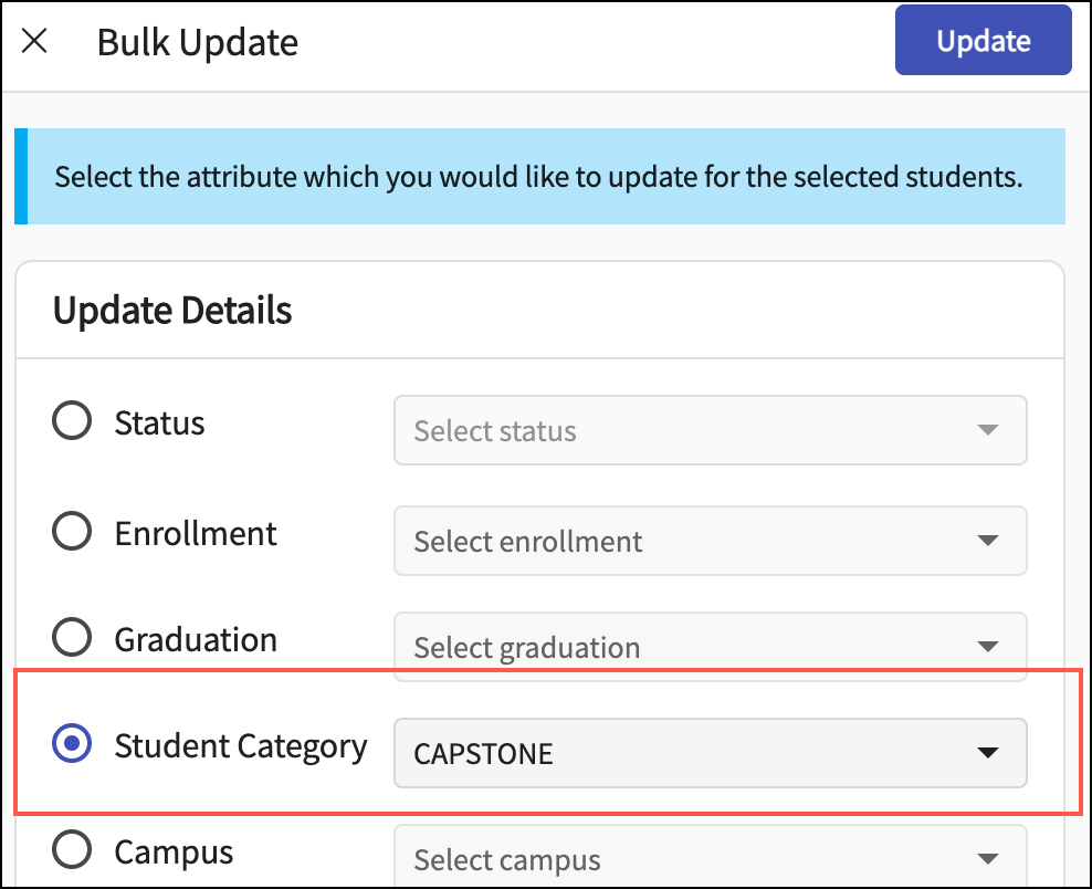 The Bulk Update drawer appears, allowing you to update the selected students to the Capstone category all at once.Select Capstone as the Student Category, then click Update.