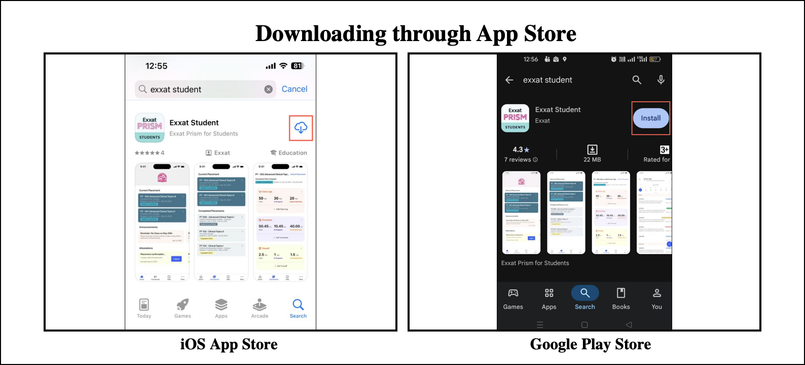 The Exxat Student mobile application is compatible with both Android and iOS mobile devices. The following snapshots display how to download the Exxat Prism application on both Android and iOS devices: