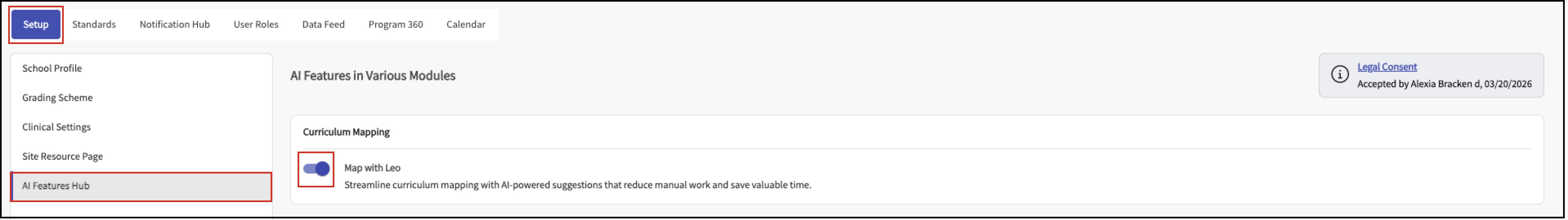 You can enable Map With Leo directly within Exxat Prism. This allows authorized users to review the AI Policy, provide consent, and activate the feature for a specific program—without requiring manual consent collection by Exxat.