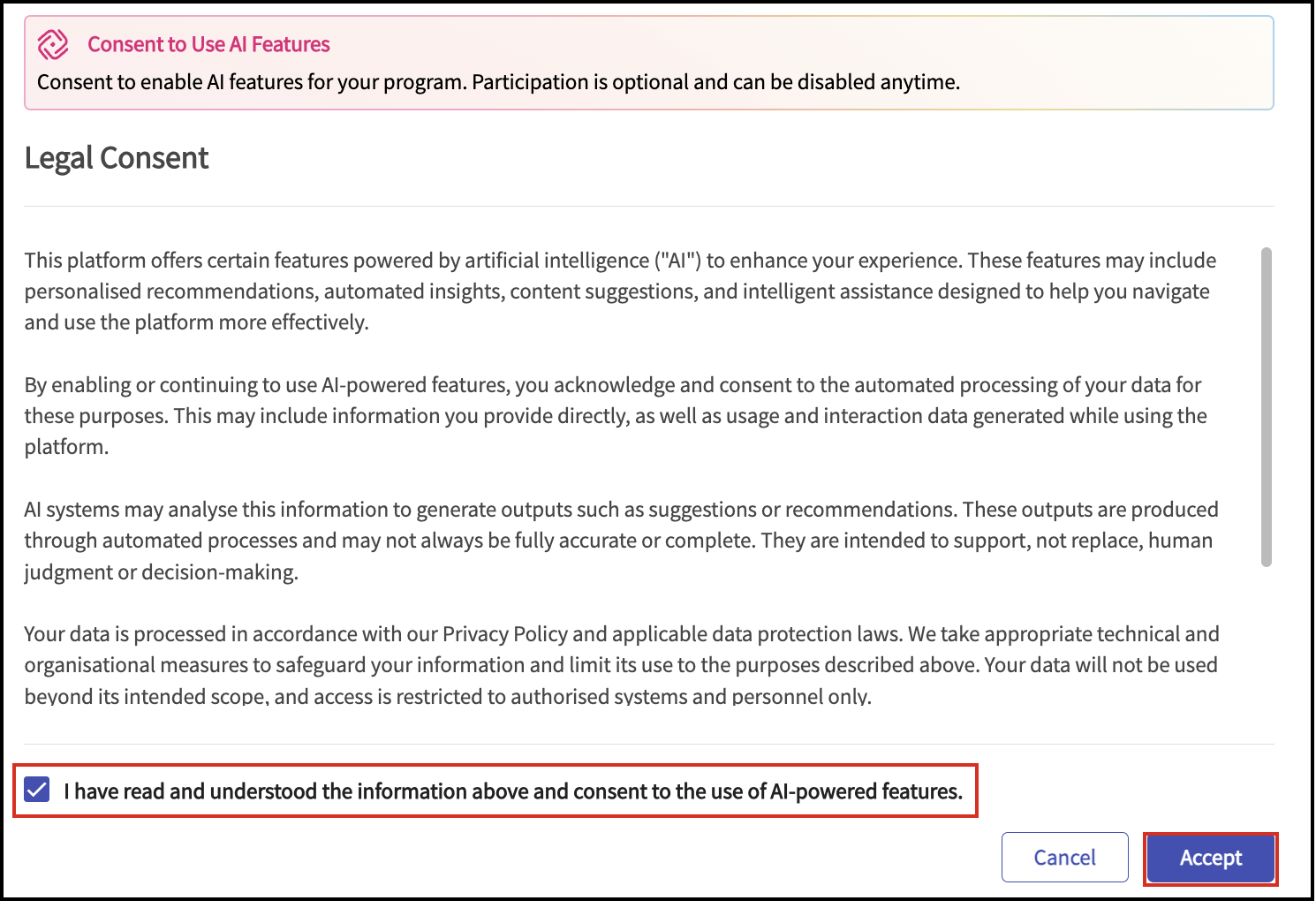 - Acknowledge that you have read accept the AI Policy & Data Usage terms, by clicking the checkbox for the consent.