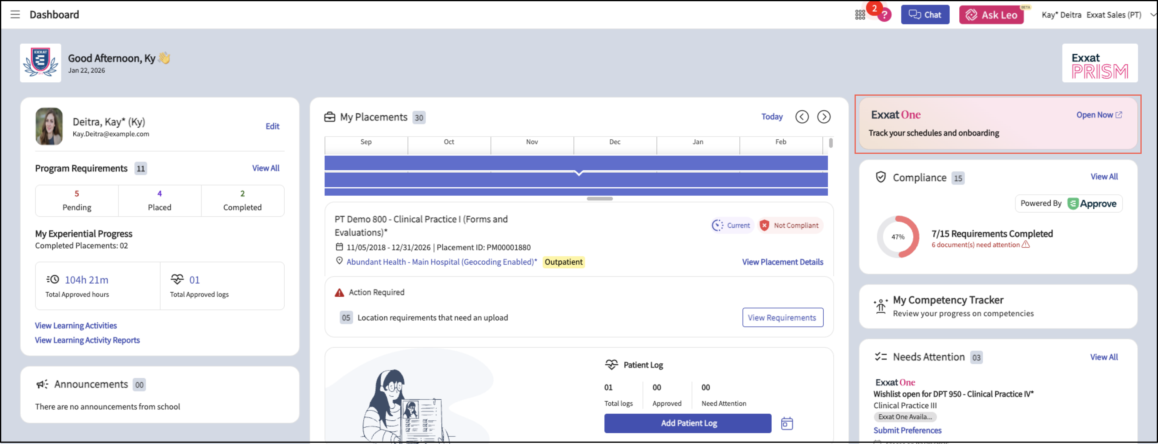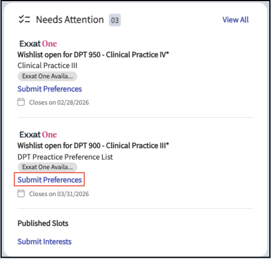 All open ExxatOne Availability-based Wishlists appear in the Needs Attention section of the Exxat Prism Student Dashboard. These wishlists are labeled ExxatOne for easy identification.