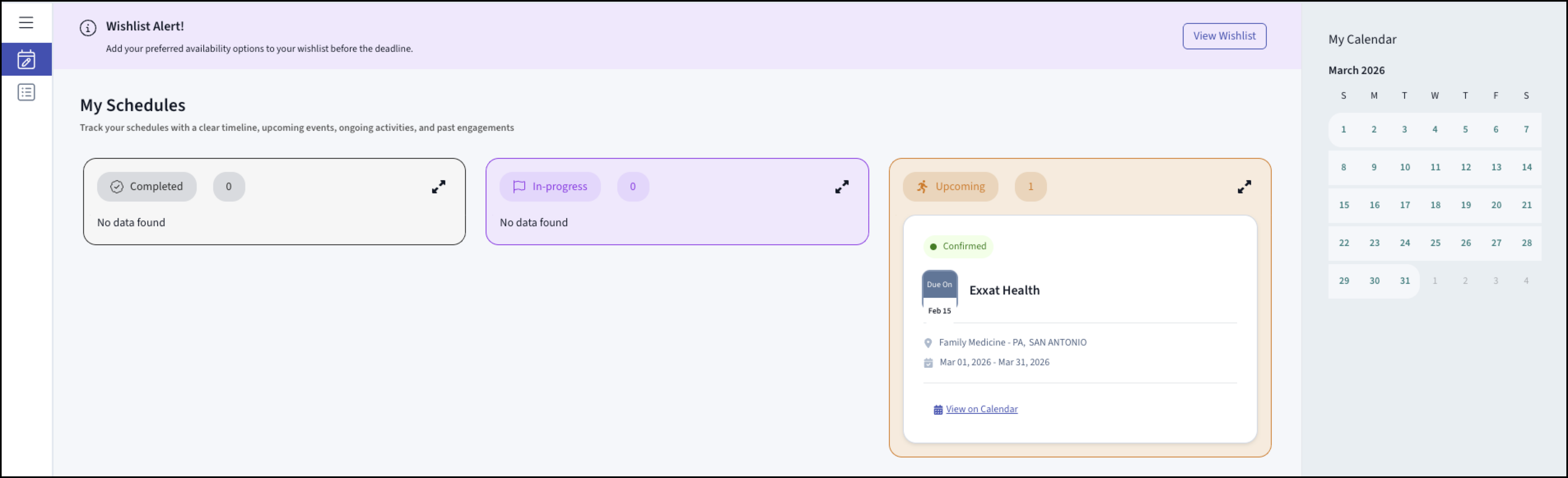 Once you are assigned or scheduled to a rotation or placement, it will appear on the My Schedules page in ExxatOne.