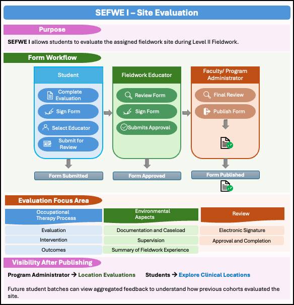 SEFWE I allows students to evaluate the assigned fieldwork site during Level II Fieldwork.