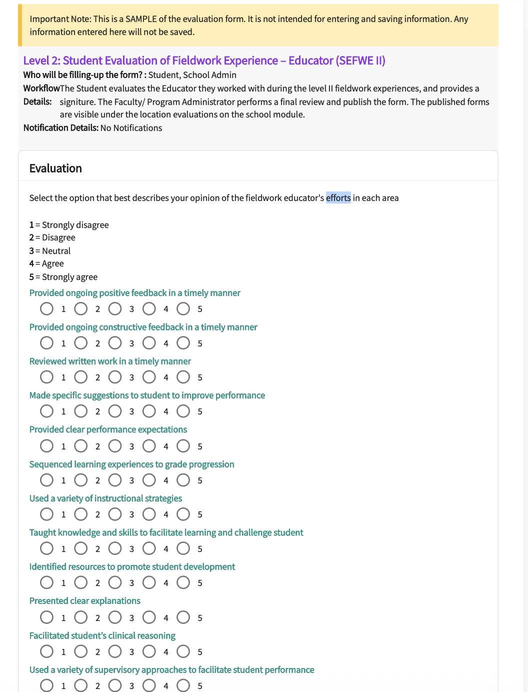 SEFWE II allows students to rate and provide feedback on their Fieldwork Educator.