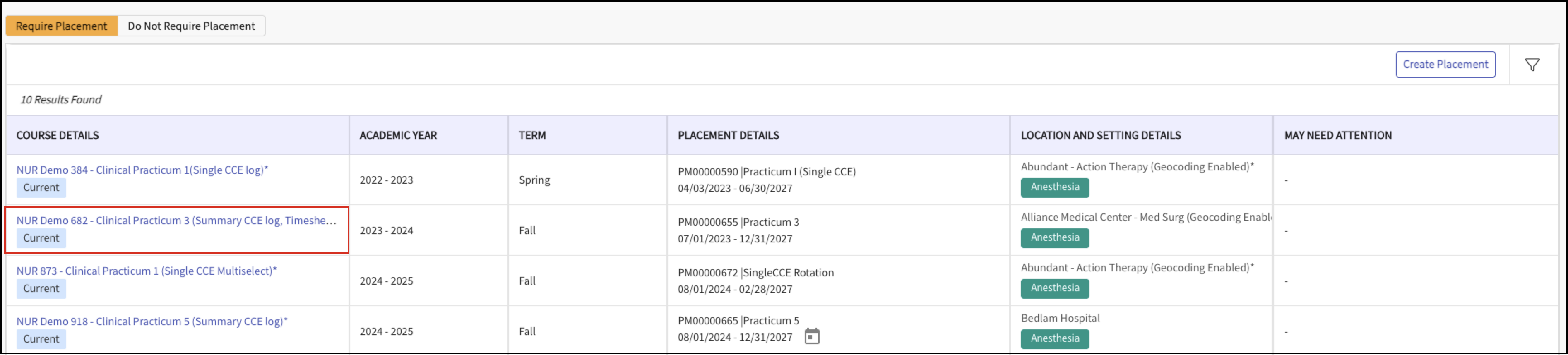 On the Coursework page, navigate to the Require Placement tab and click the course name to view its details.
