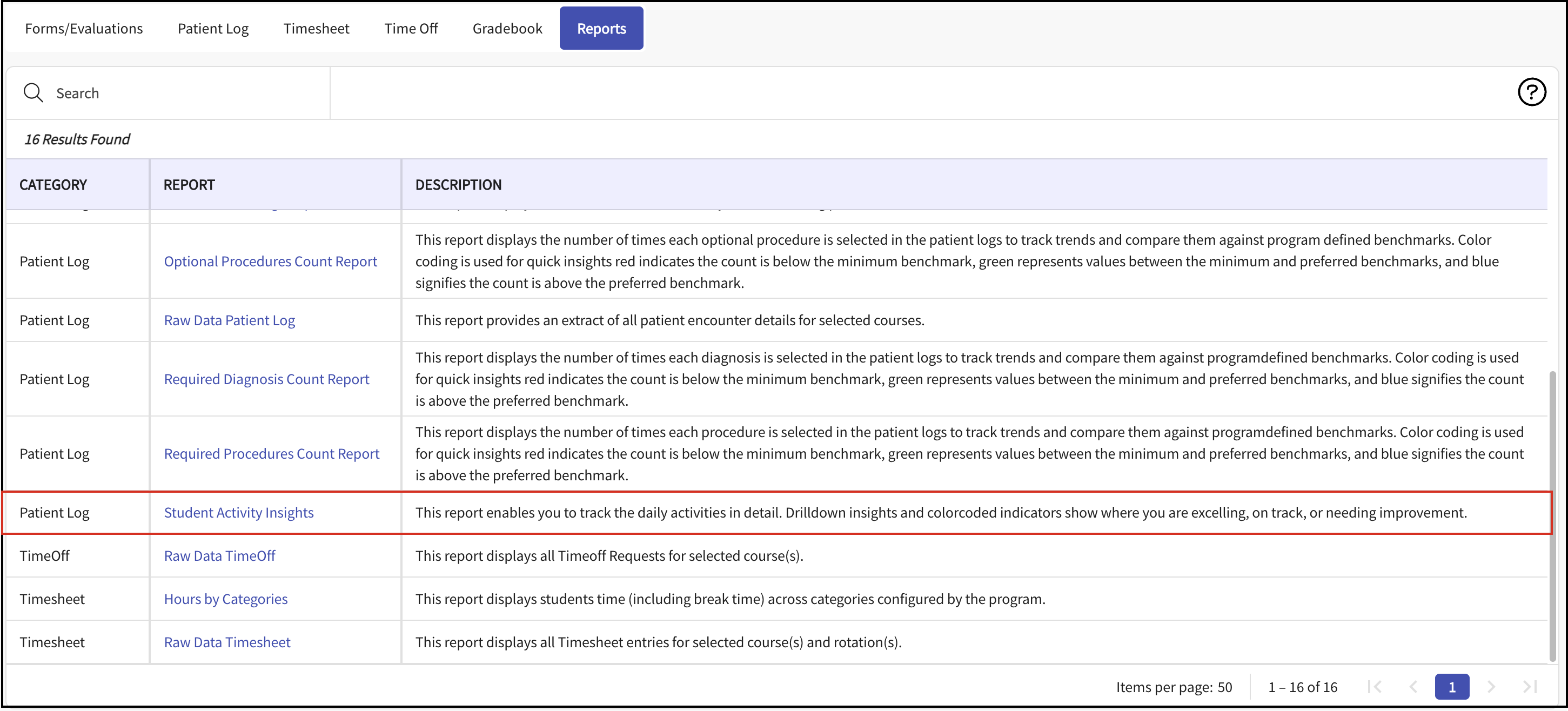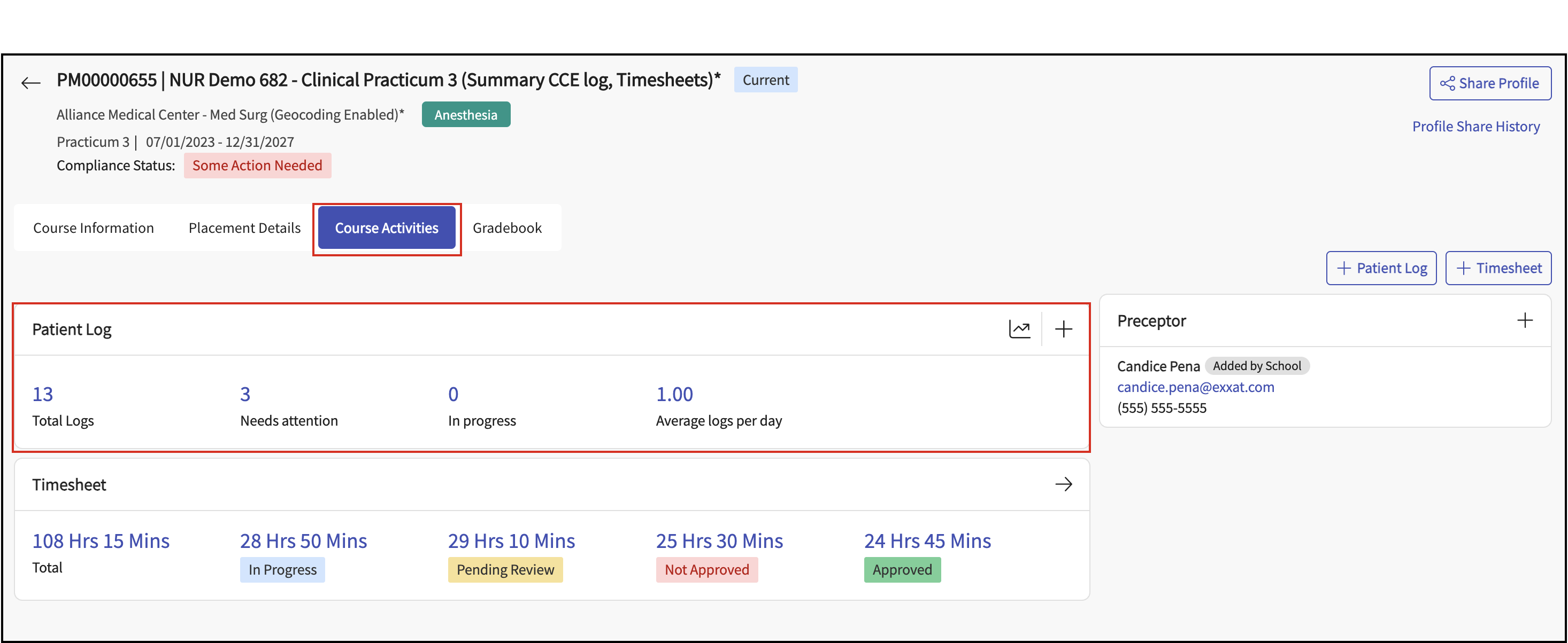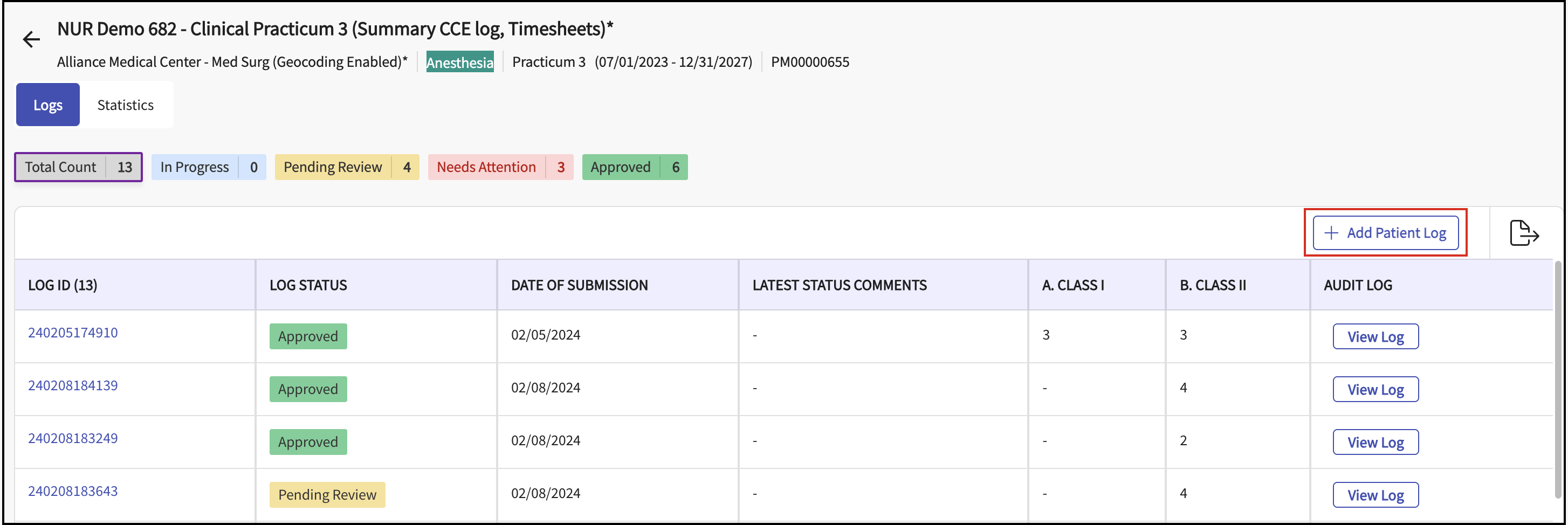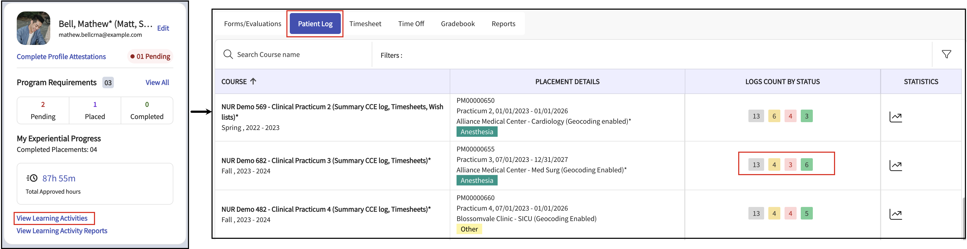 In the course details page, navigate to the Course Activities tab and go to Patient Log section.