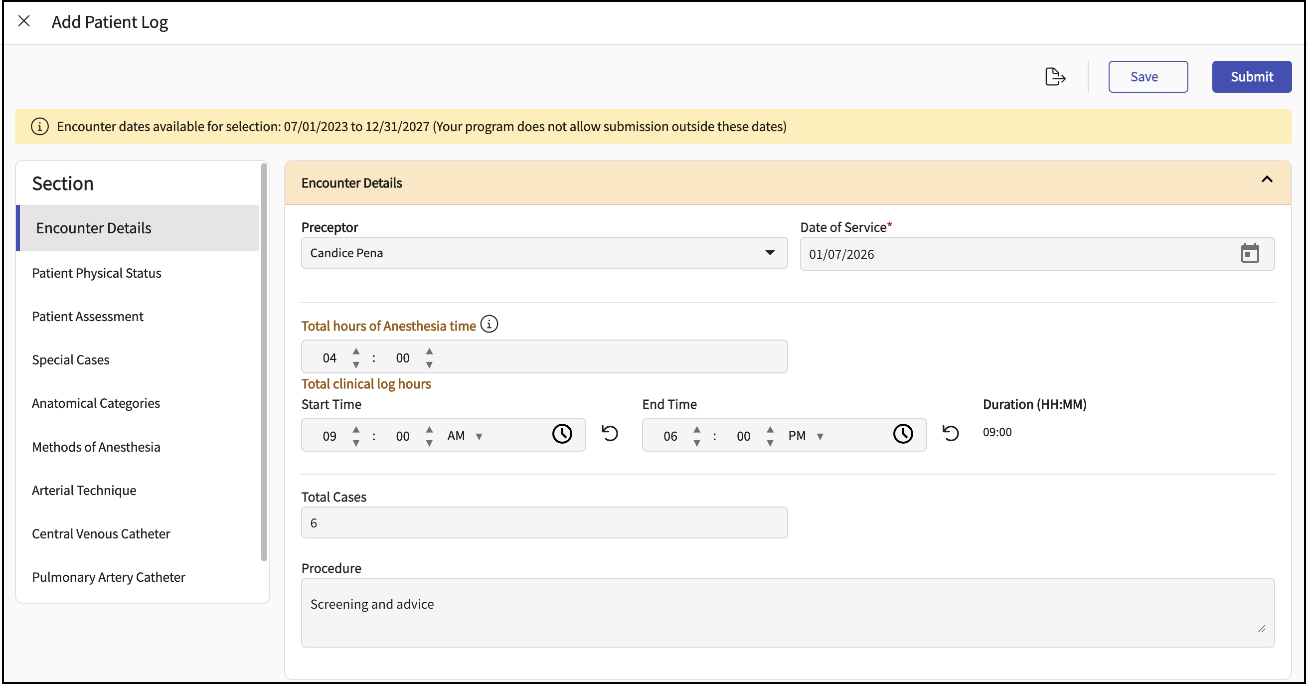 Each log entry represents one patient encounter and contributes toward your overall case count and competency tracking.
