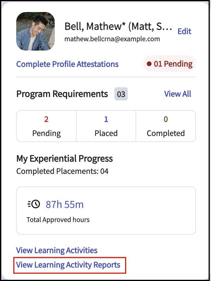 Alternatively use this path: From the Student Dashboard > View Learning Activities > Patient Log > Select the course and Click on the Log Status for the course.