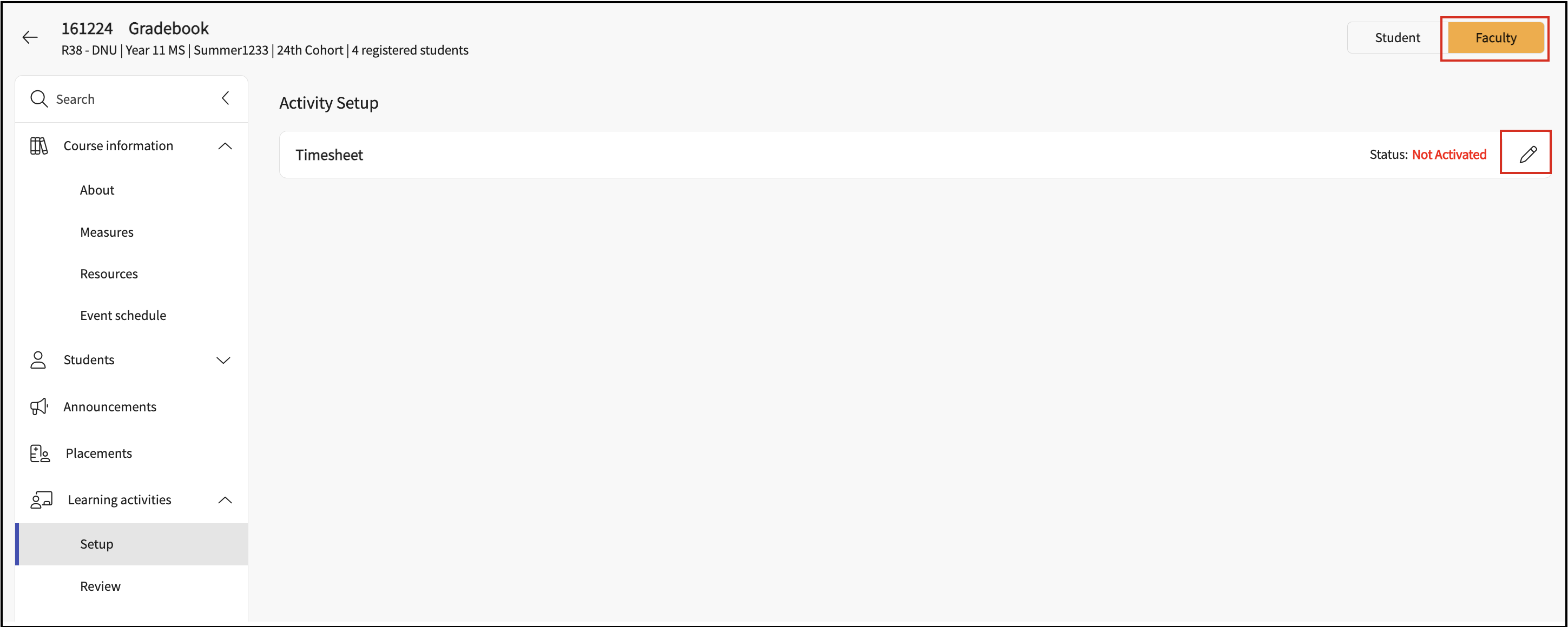 In the left-menu, go to Timesheet and then click Faculty in the top right of the Learning Activity page to switch to the Faculty tab