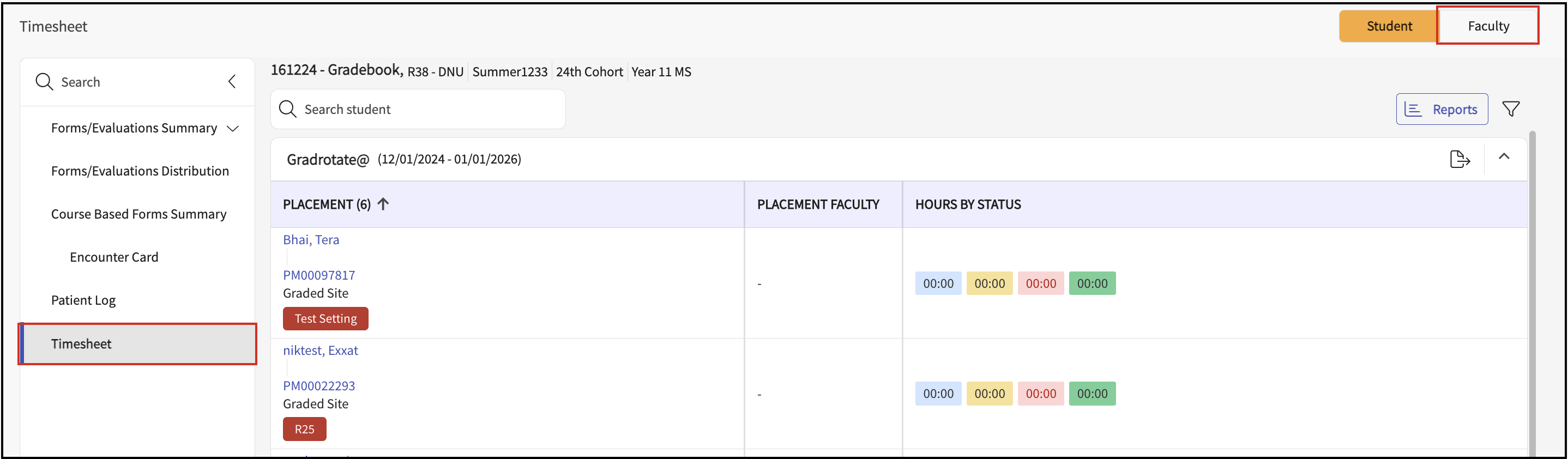 The Faculty Timesheet feature in Exxat Prism provides administrators with a centralized interface to monitor, review, and manage faculty supervision hours recorded during clinical placements.