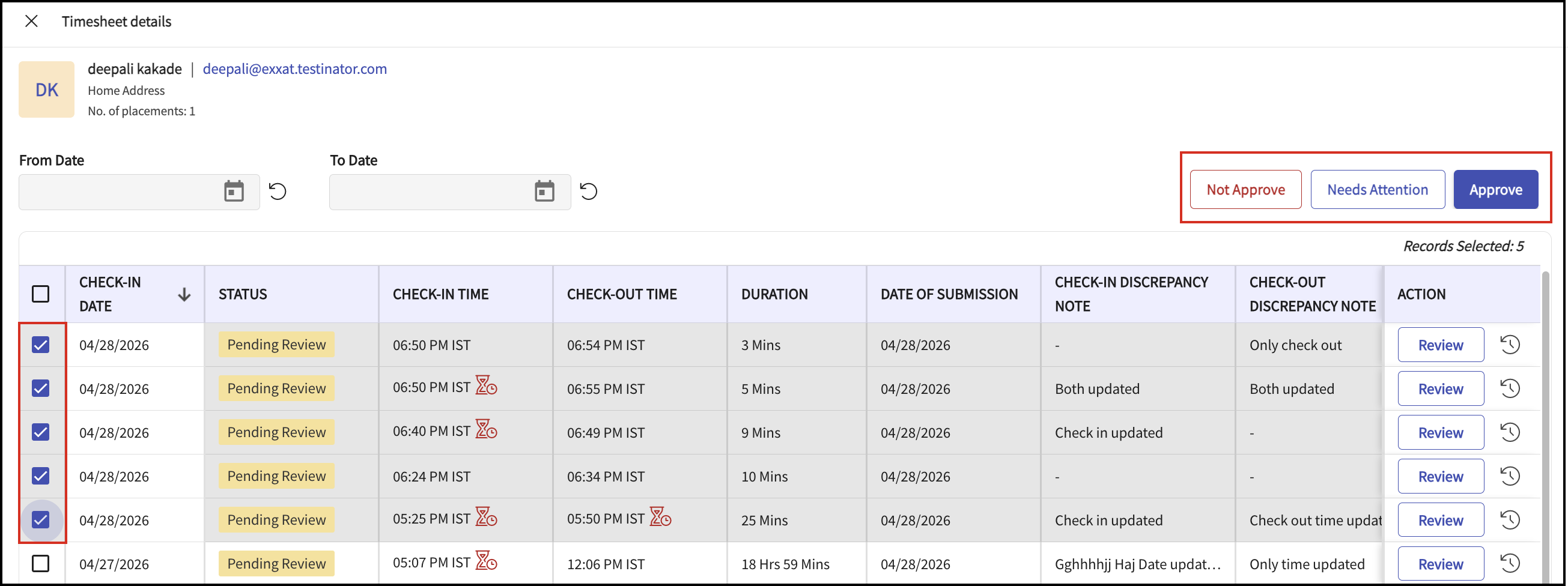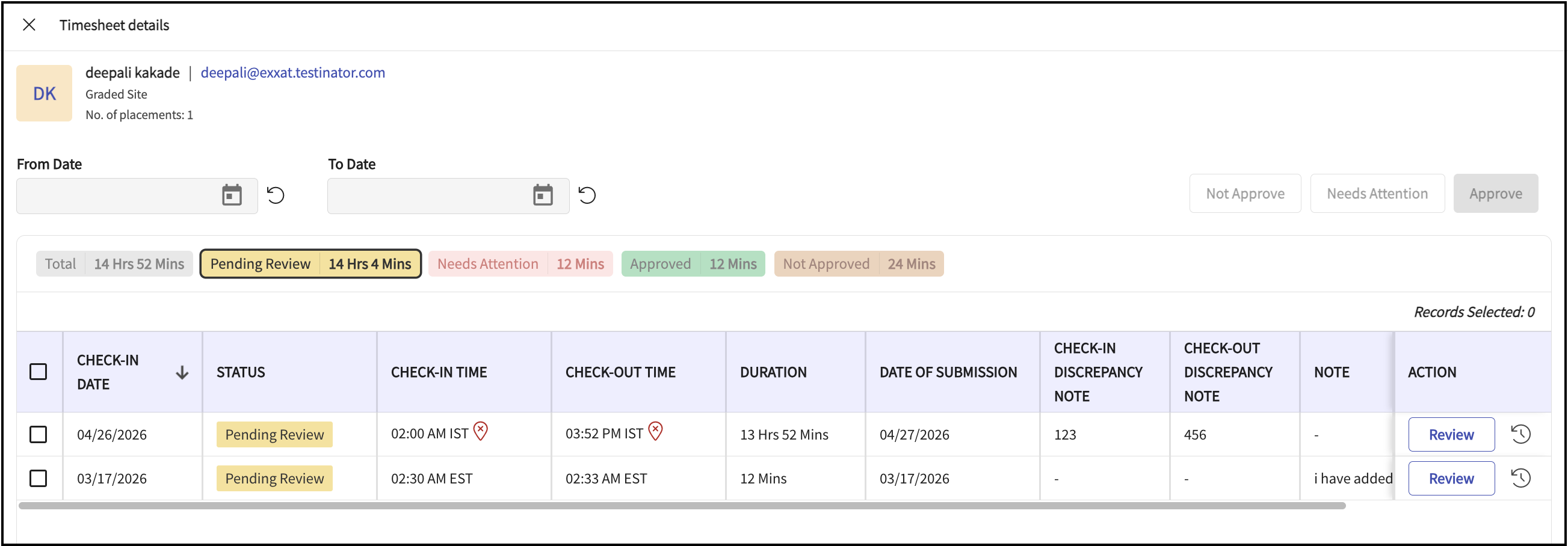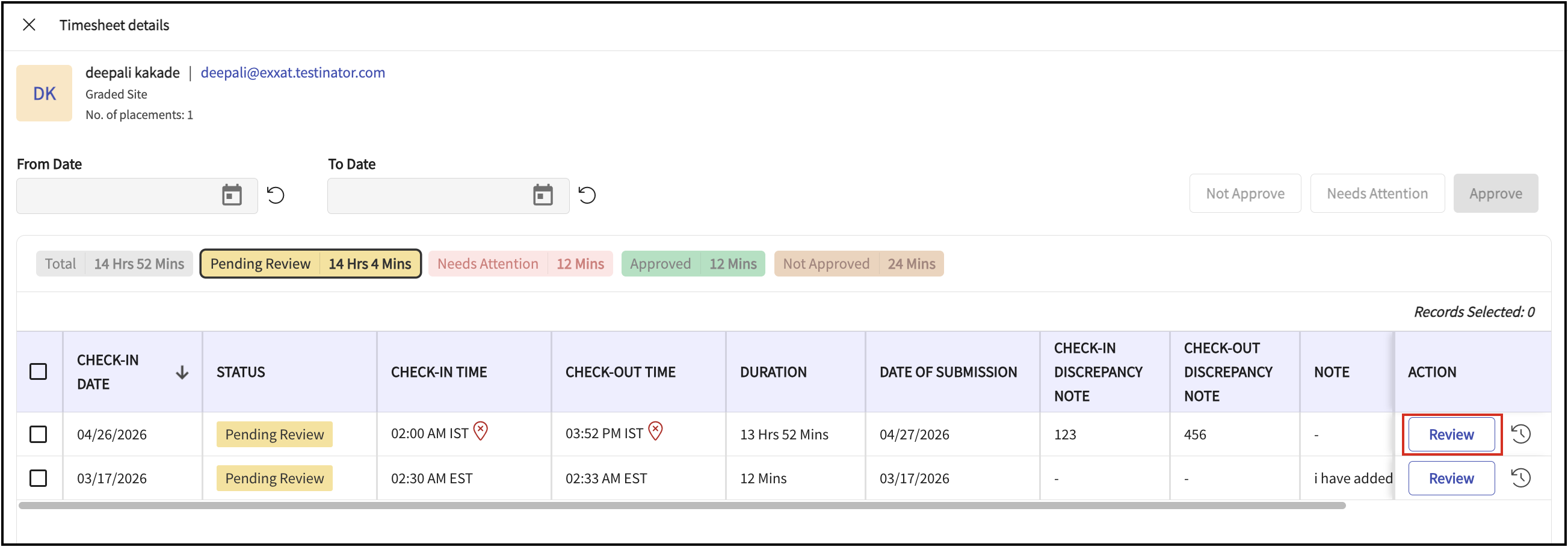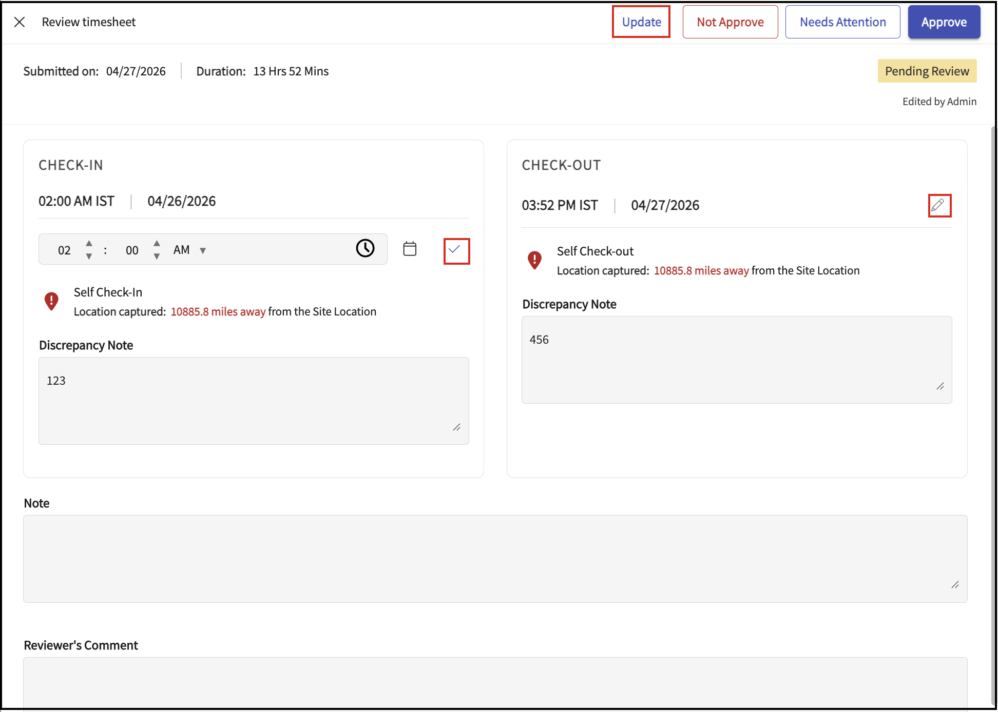 Administrators can review timesheets, verify check-in and check-out details, and check discrepancy notes. They can also approve entries or flag them for correction.