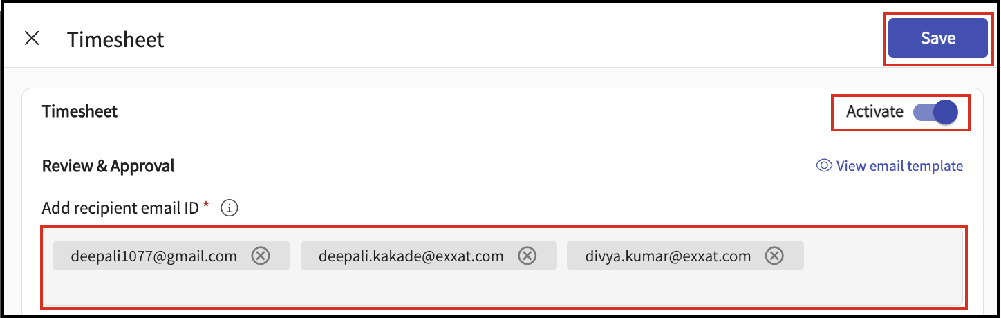 In the Review and Approval section enter the email ids of email recipients who should receive the email notification every time a timesheet is submitted by the faculty.