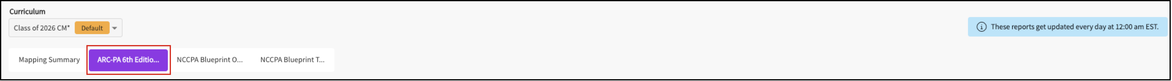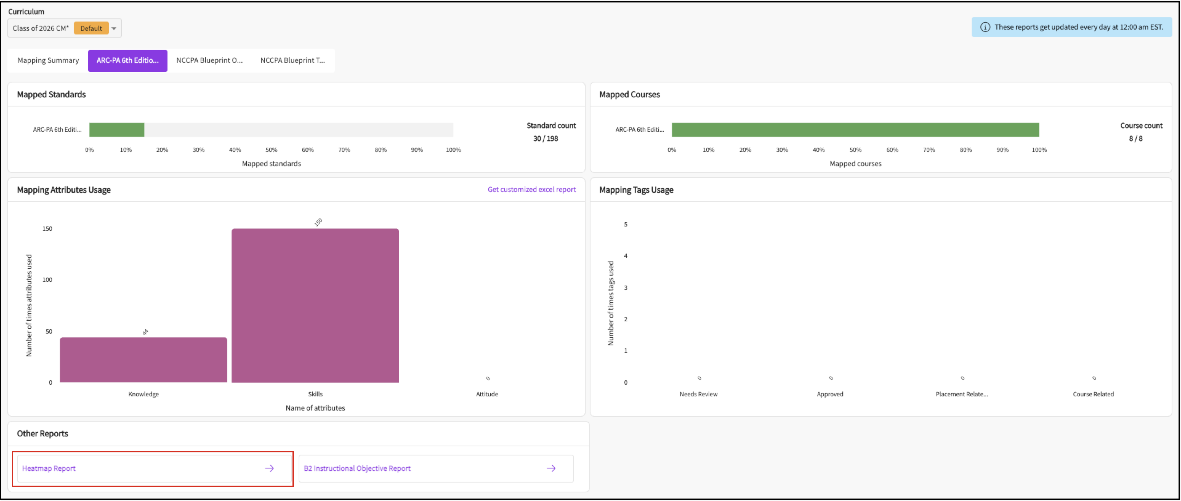 Note: This report option appears only for PA programs using the ARC-PA 6th Edition mapping.Scroll down to the Other Reports section and click Heatmap Report.