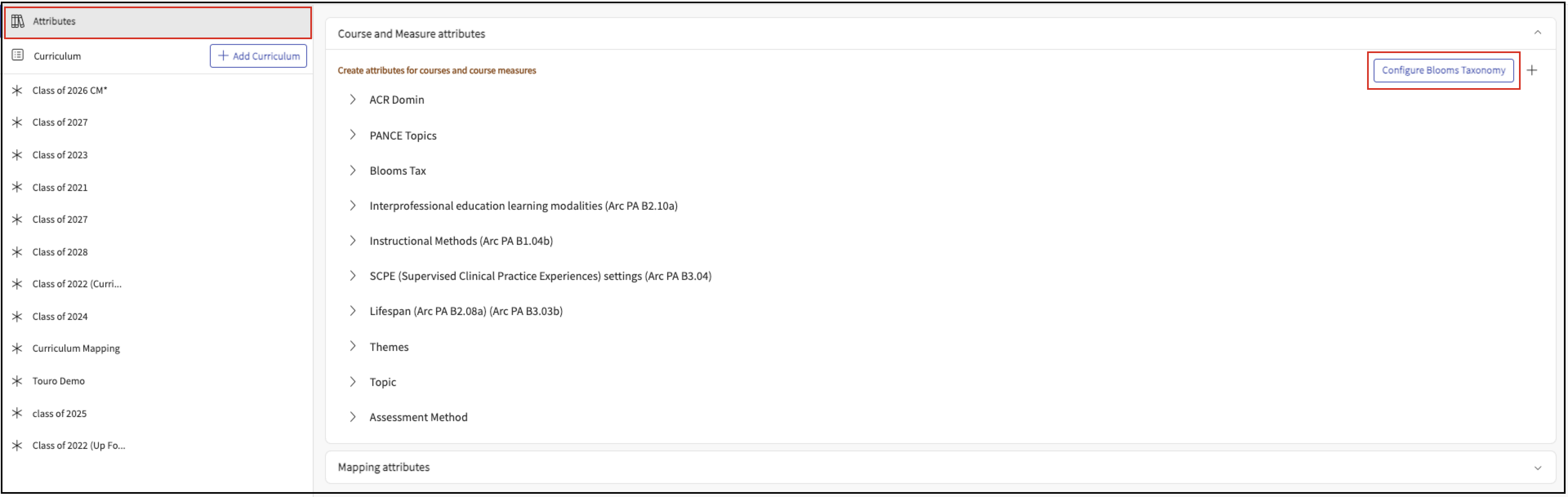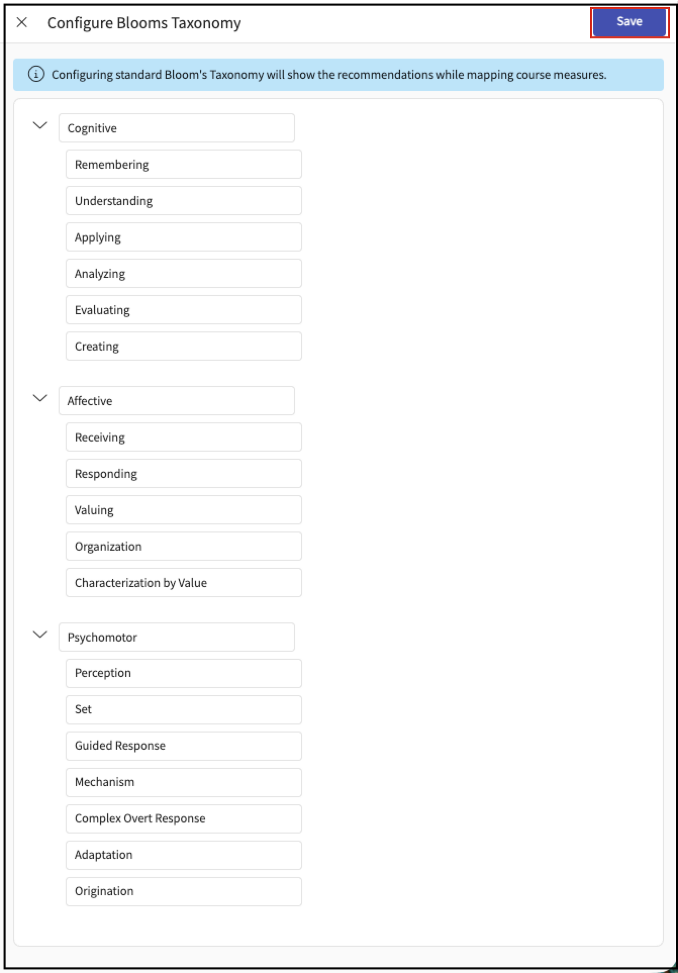 You can set up Bloom’s Taxonomy once and use it across your curriculum. Once configured, Bloom’s Taxonomy can be used during course measure mapping with AI-assisted suggestions.