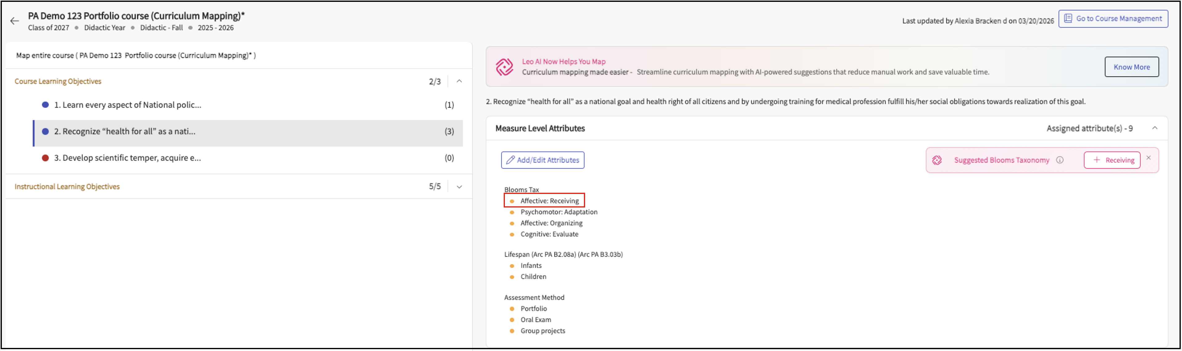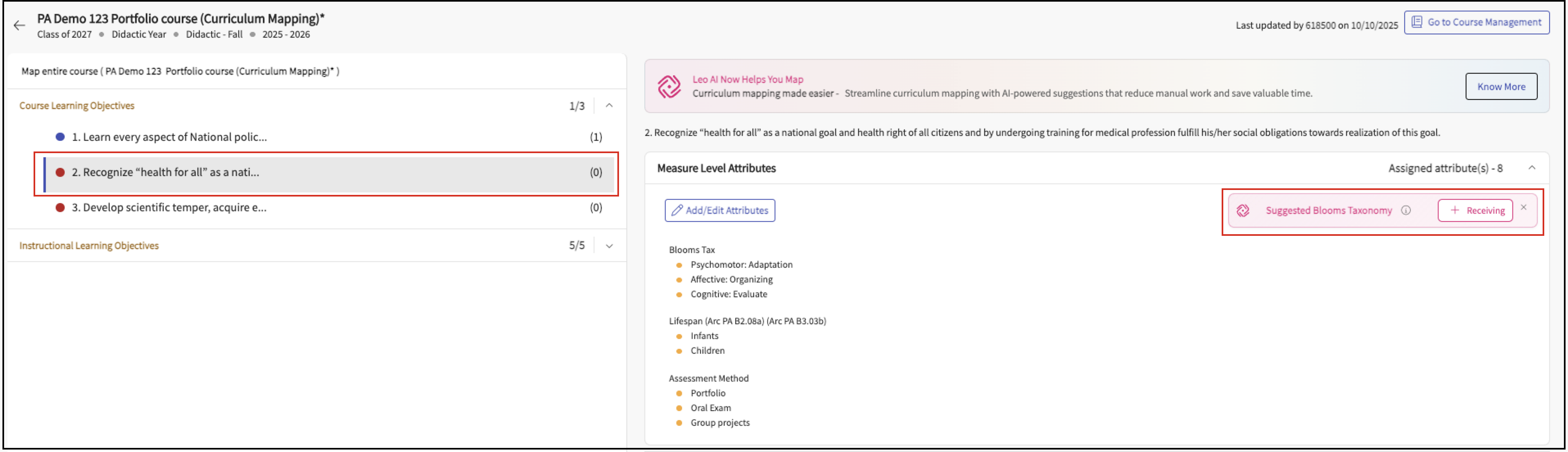 Leo-AI reads the measure (especially the action words like analyze, apply, etc.)Click the suggestion to apply the Bloom's Taxonomy level as an attribute.