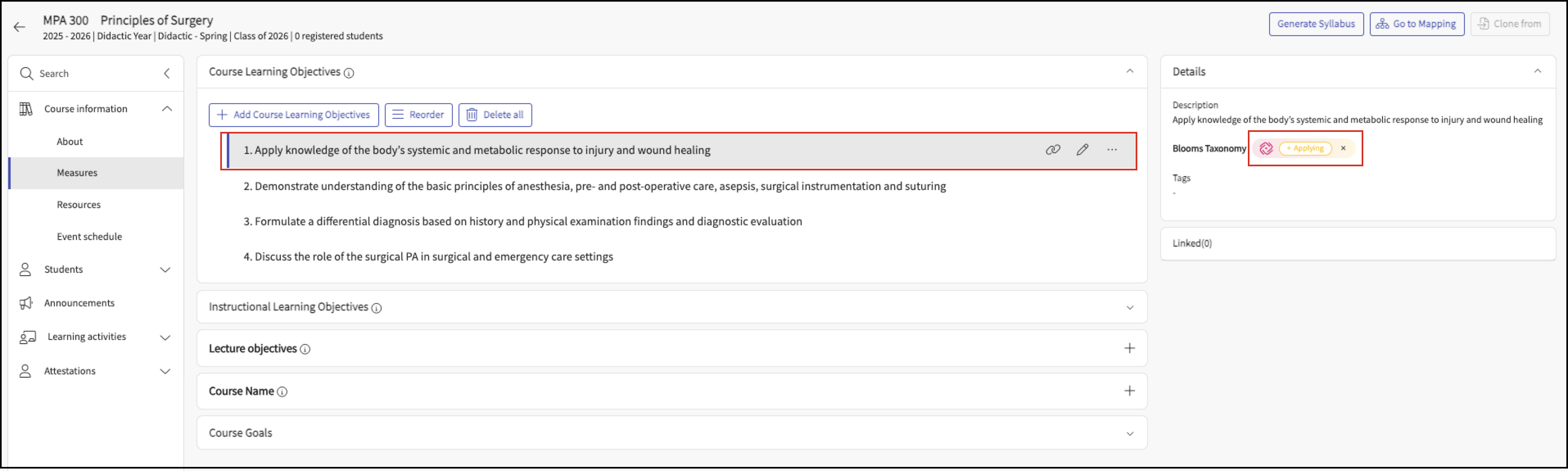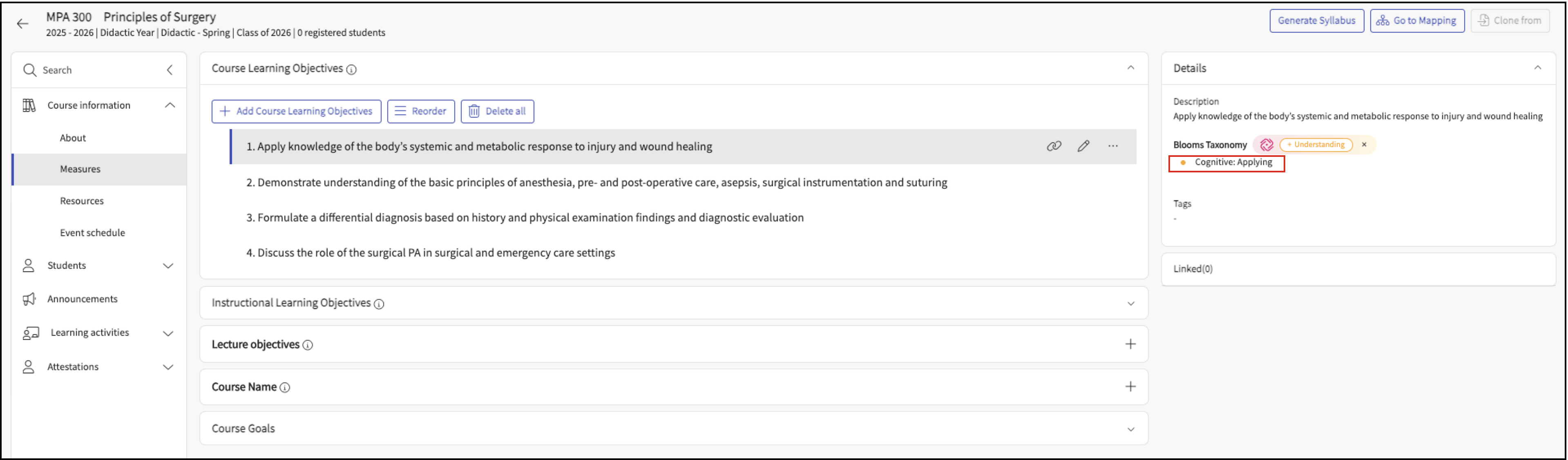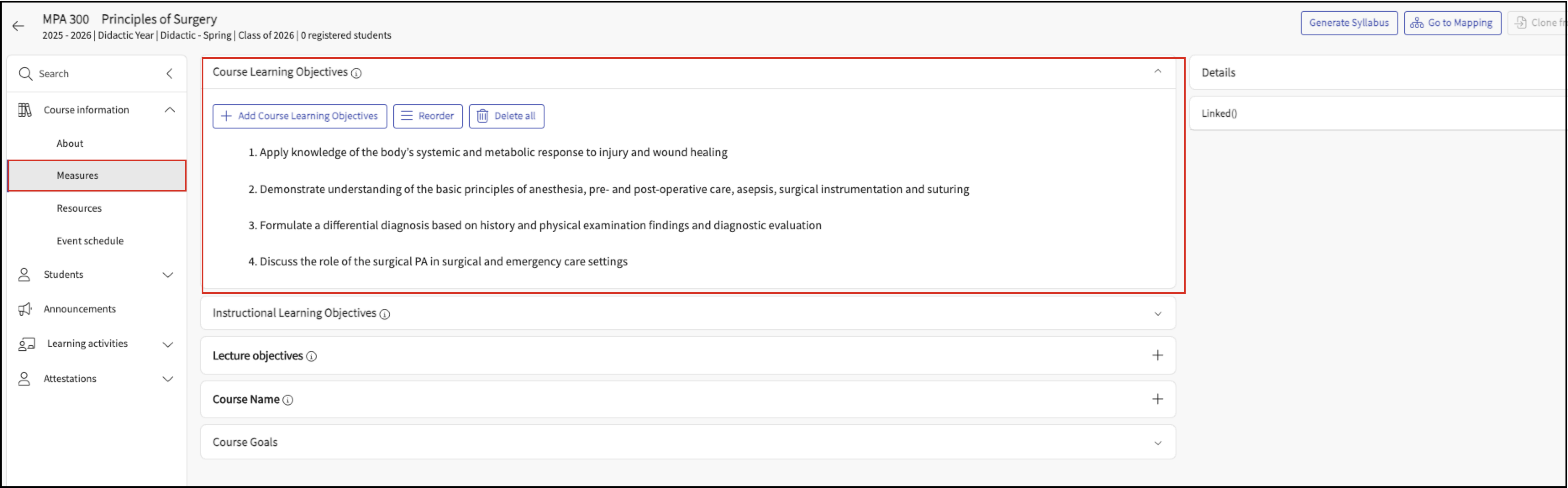 In the Course Details page navigate to the Measures menu, and click to expand the Course Learning Objectives section.
