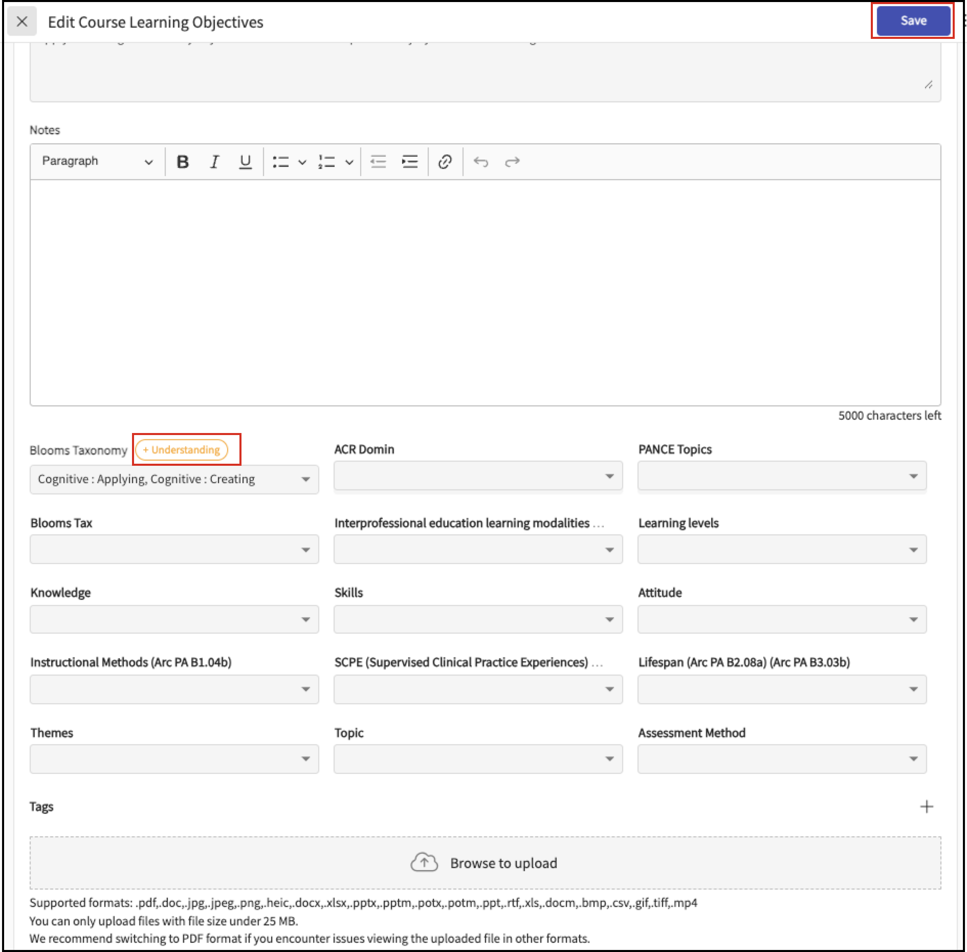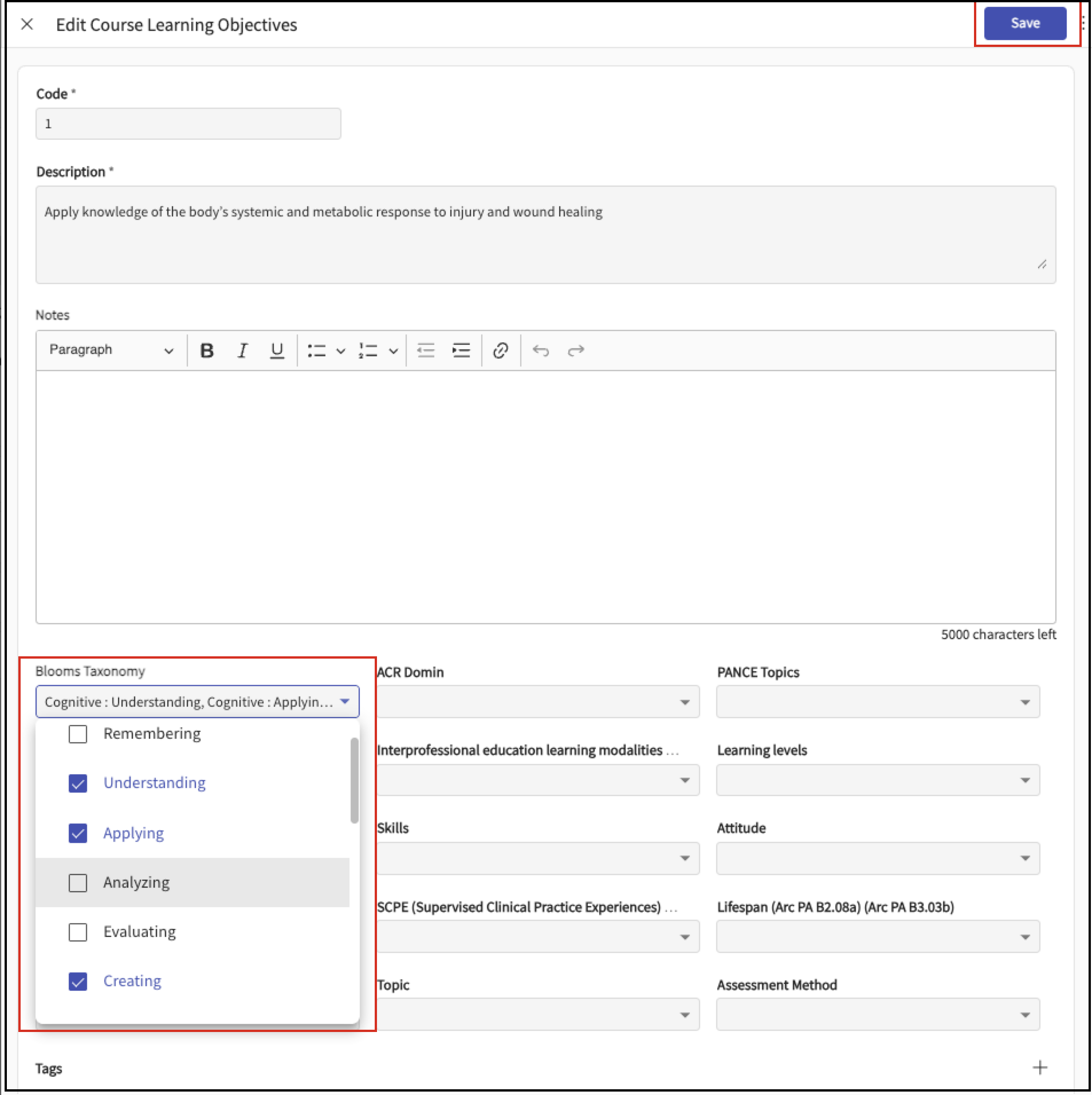 In the Edit Course Learning Objectives drawer, scroll down to Bloom's Taxonomy drop-down.