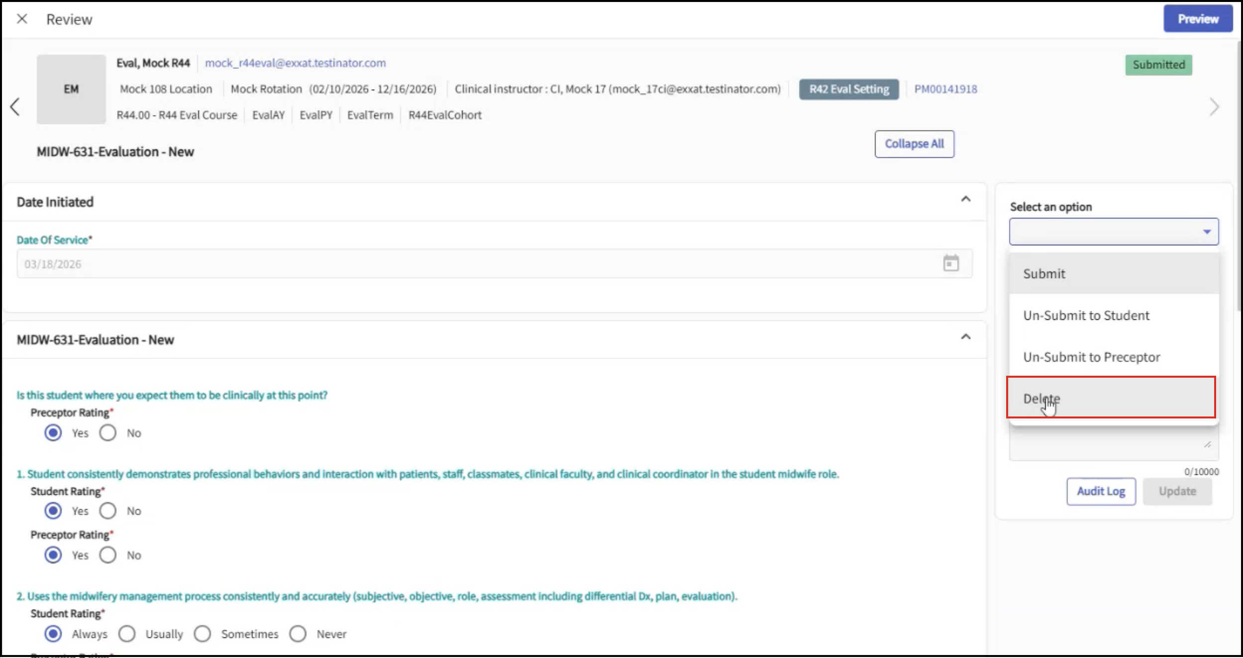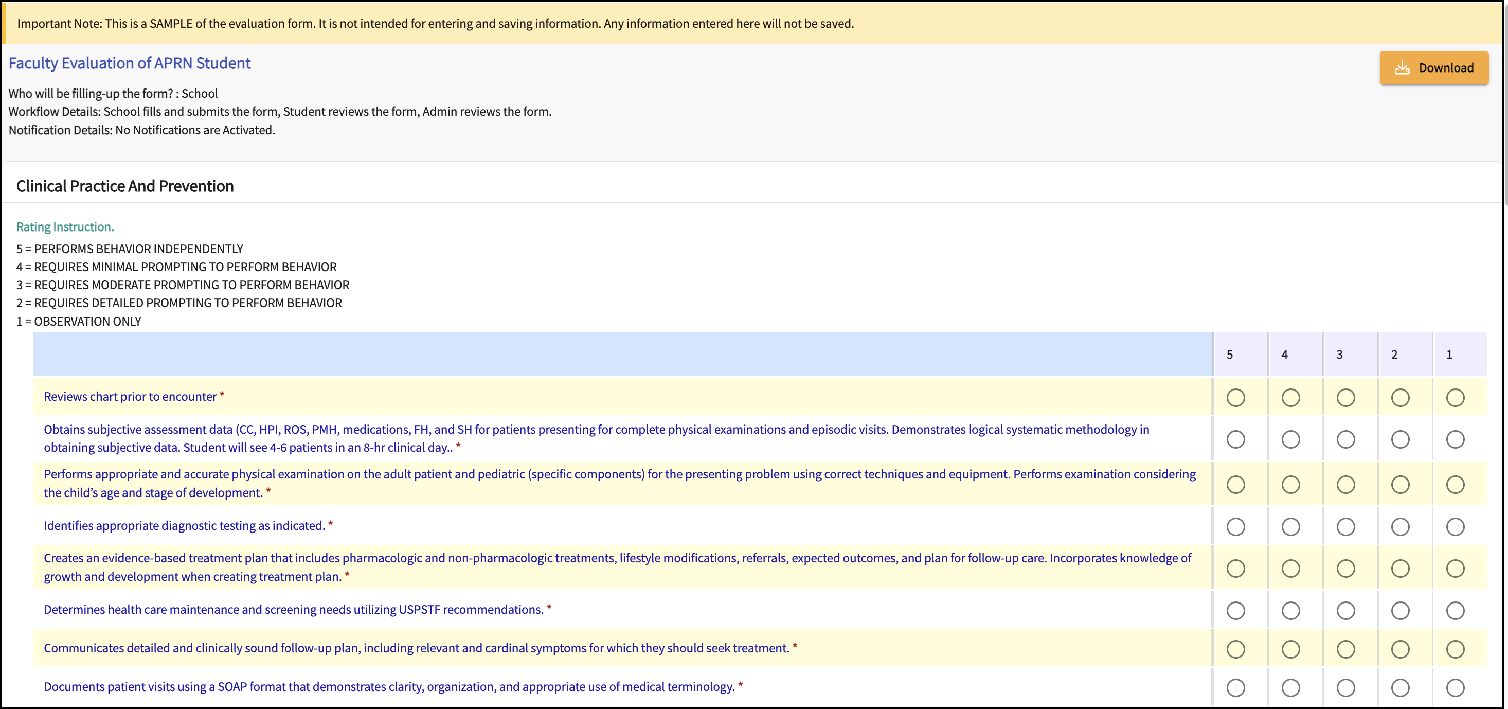 - A student evaluation completed by both preceptor and faculty