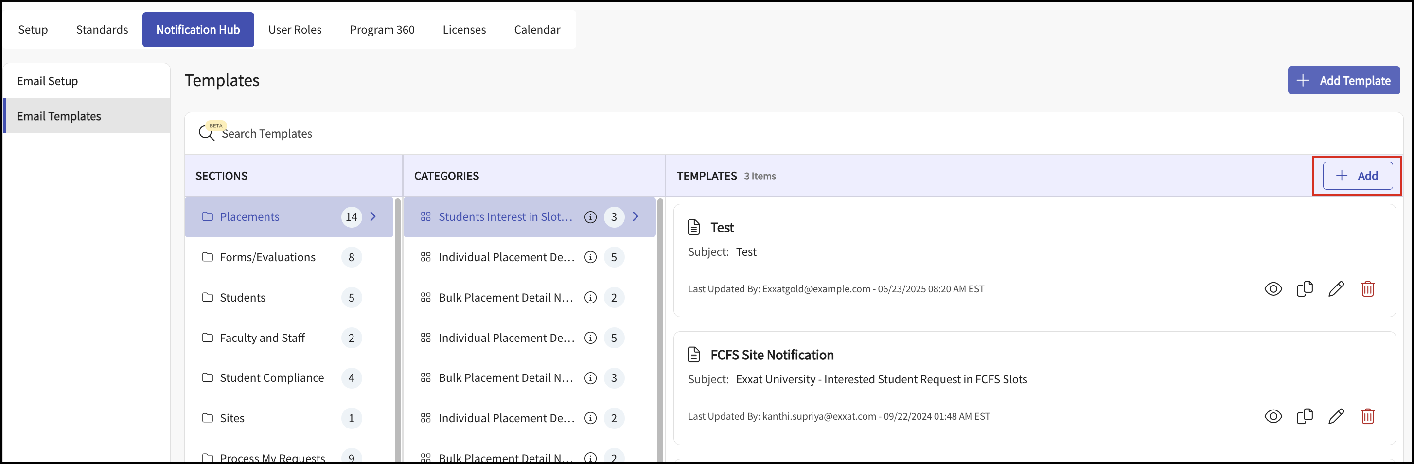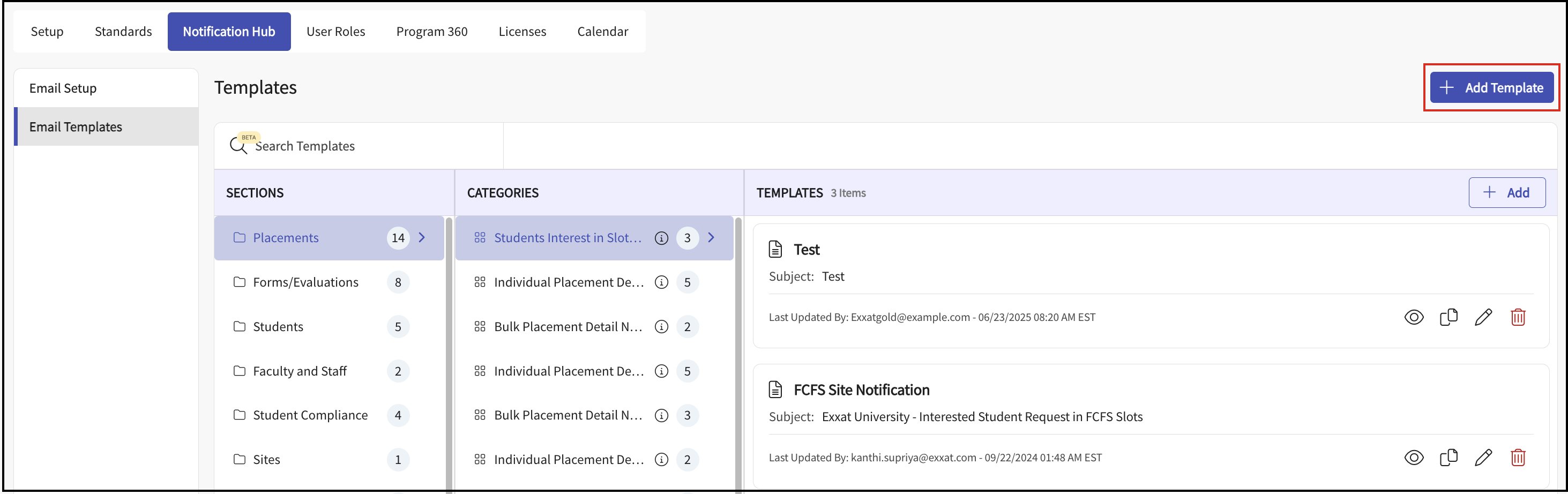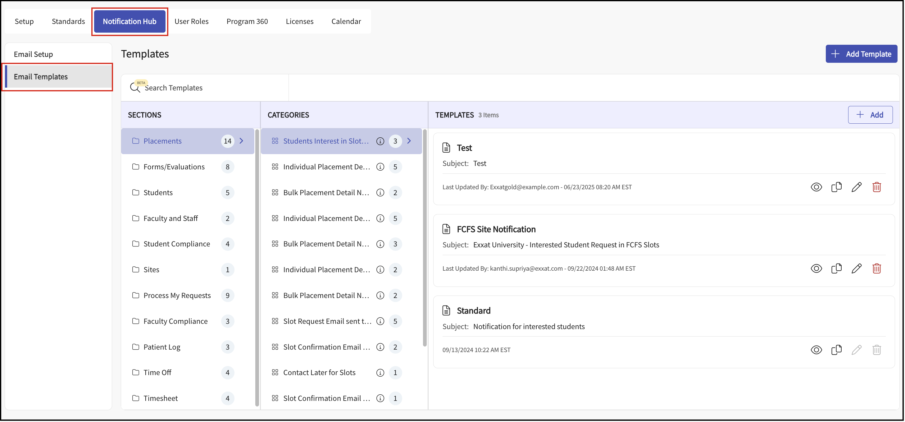 The Notification Hub in Exxat Prism centralizes all email-related configurations and templates for your program, allowing you to manage communication from one place.