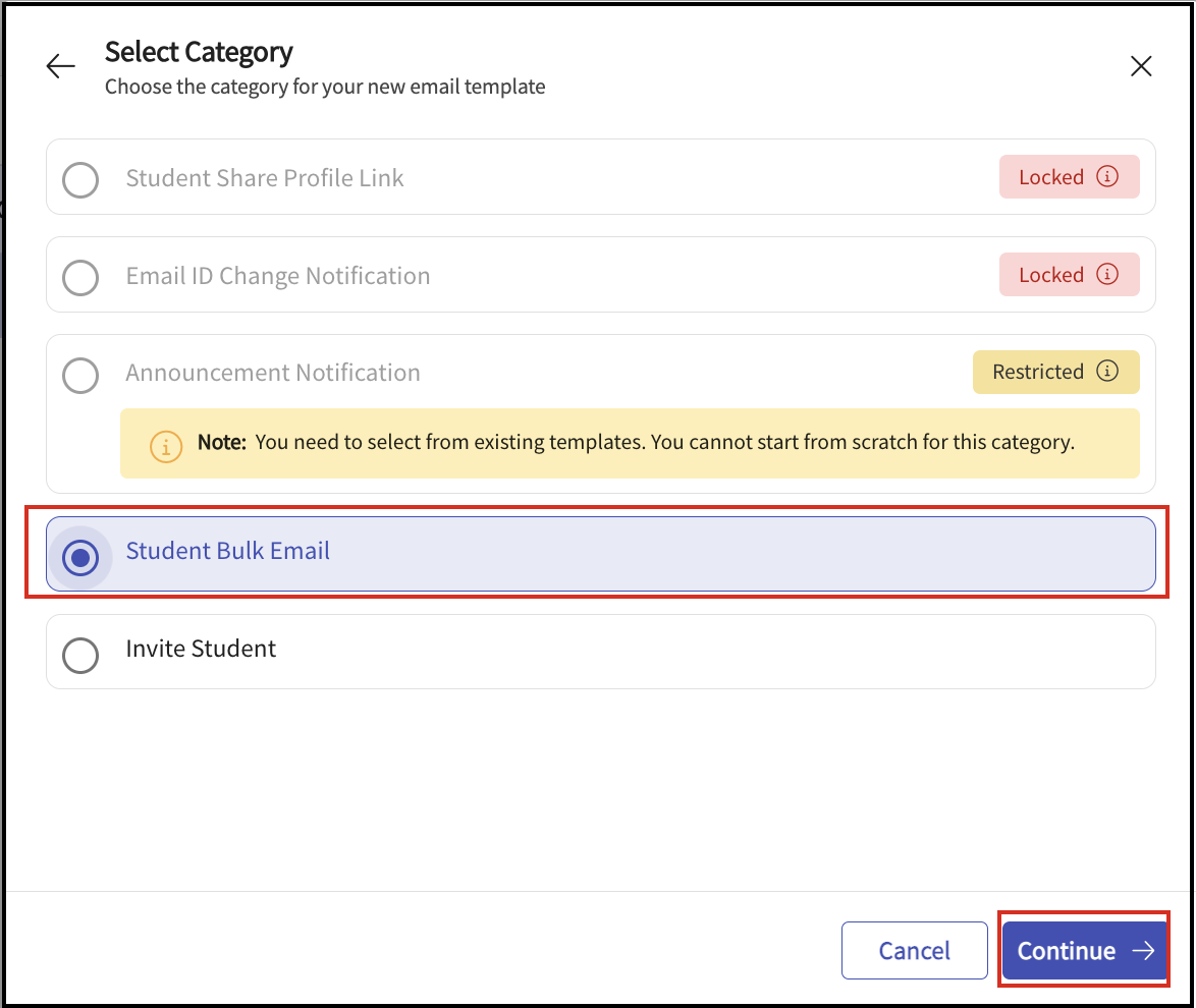 - Choose a Category (Example: Invite Student, Bulk Placement, and similar)