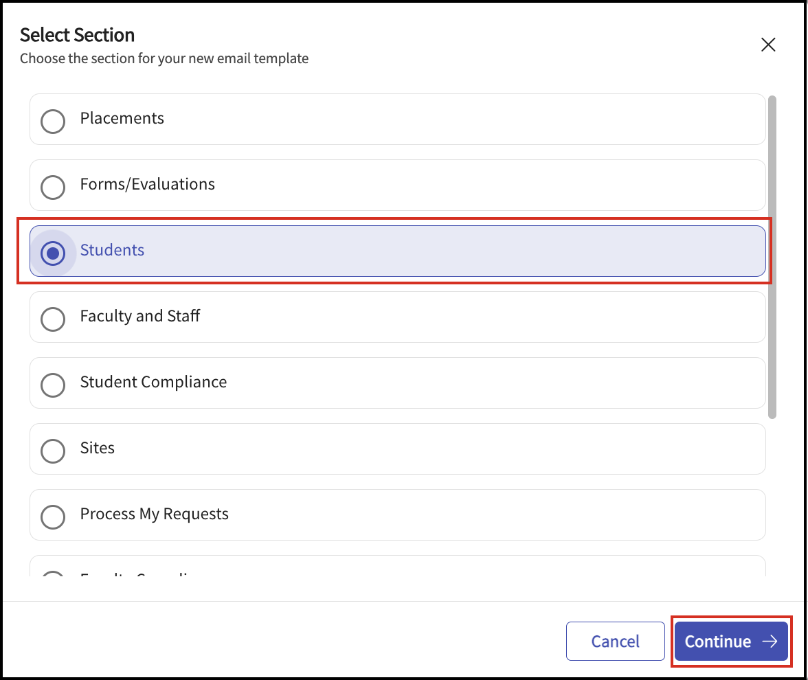 - In the Templates page of the Email Template Manager, select a Section (Example: Modules such as Student, Faculty, and similar)