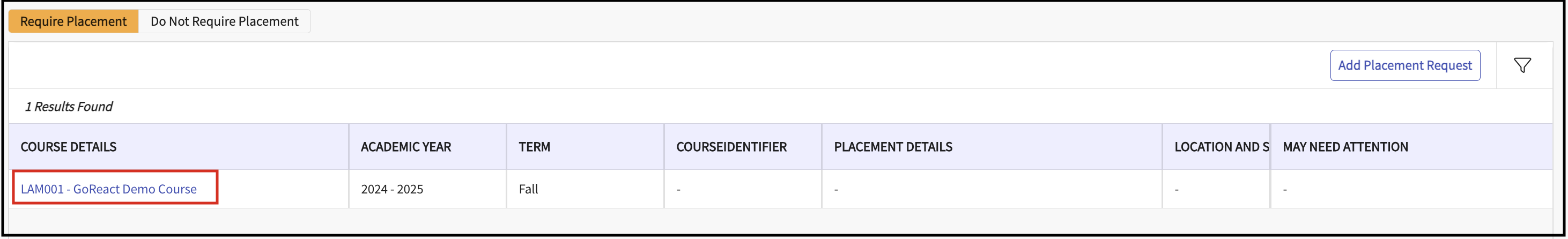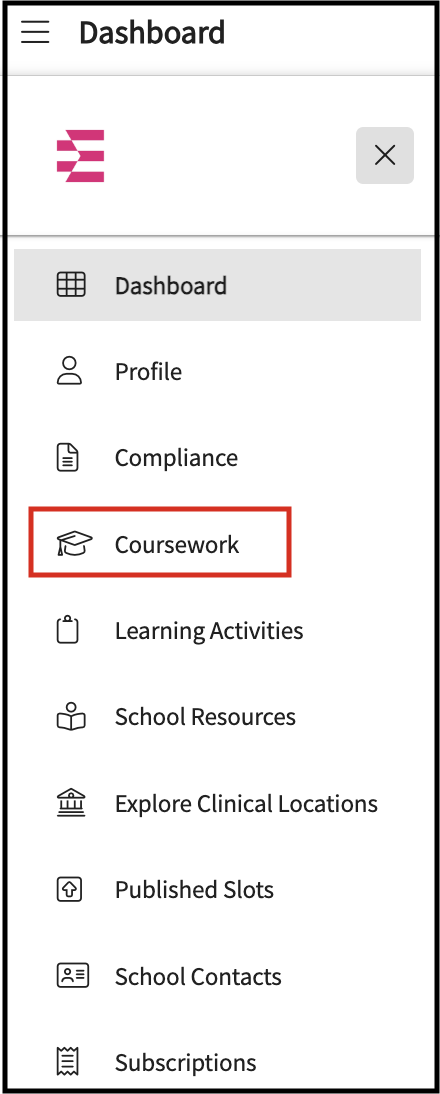 From the hamburger menu select coursework.- GoReact Assignment can be for a placement course or a non-placement course. In the Coursework page, select the RequirePlacement tab or the Do Not Require Placement tab accordingly.